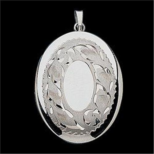 This unusual LOCKET is unusual because it is 14k WHITE Gold. It is OVAL in design with beautiful engraving. This White Gold Locket measures 1" x 3/4" and it opens for photographs.