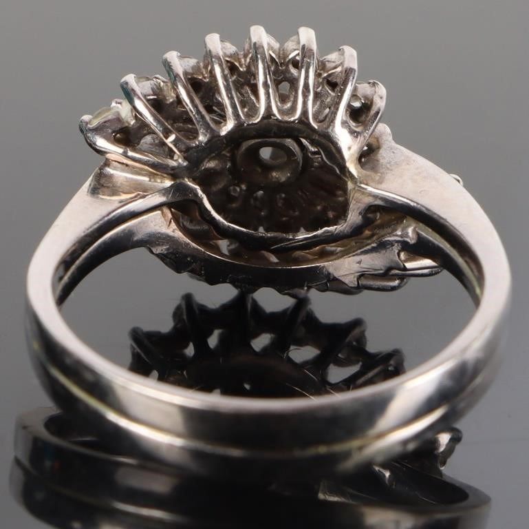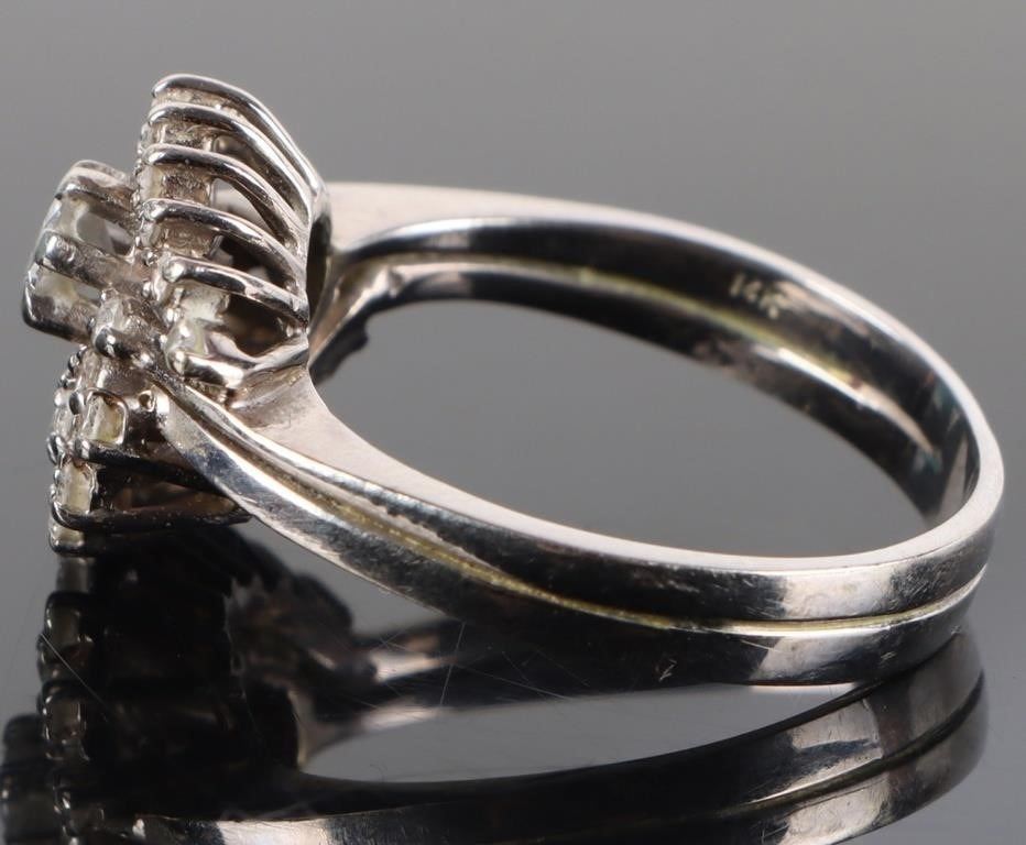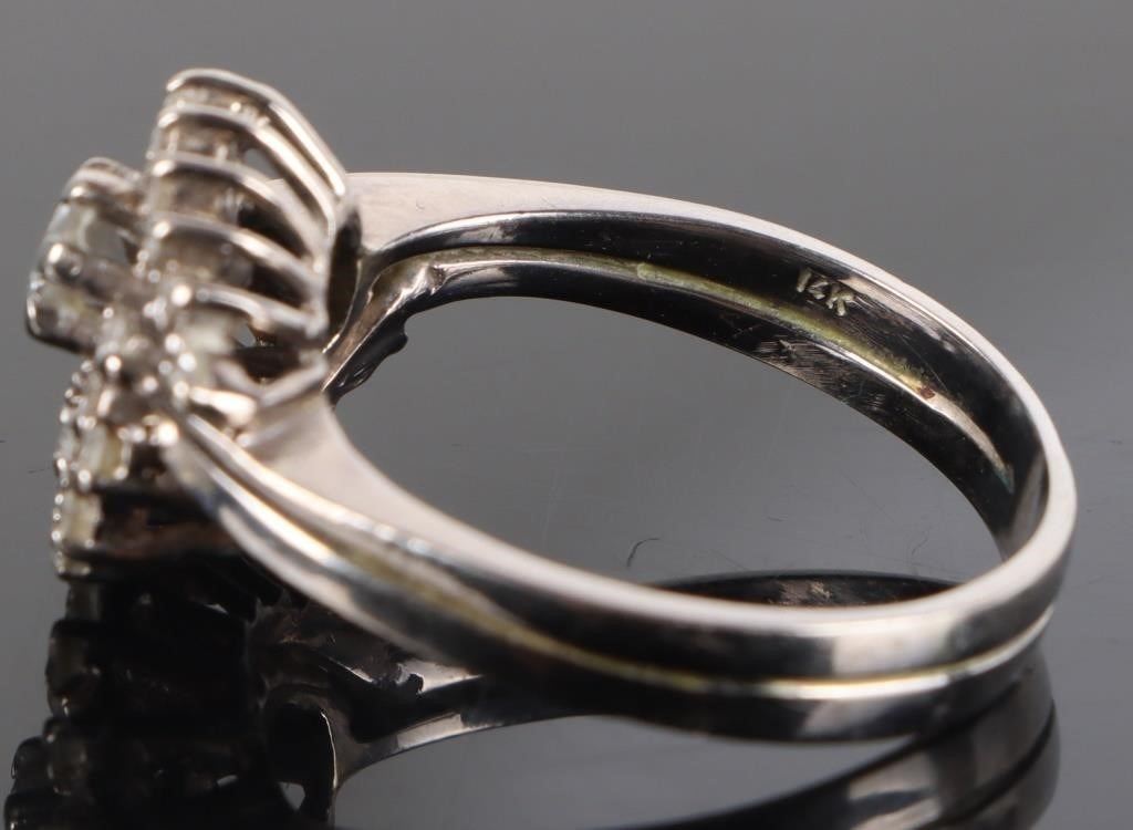 14K white gold natural diamond ladies ring includes one 0.25CT round cut natural diamond, and twenty-seven 0.02CT round cut lab diamonds. Natural diamond verified via short wave Ultraviolet fluorescence.