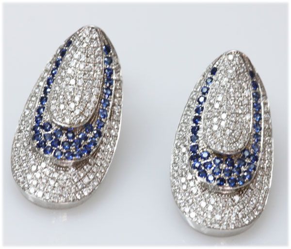14K WHITE GOLD OVAL EARRING WITH DIAMONDS **|**|** 14K WHITE GOLD OVAL EARRING WITH DIAMONDS; EST DIAM COUNT 100, EST COUNT SAPPHIRE 36 PER PIECE; METAL GOLD; MAIN STONE DIAMOND/ CYLON SAPPHIRE; DIAMOND QUALITY: VS ; MSRP: $5220