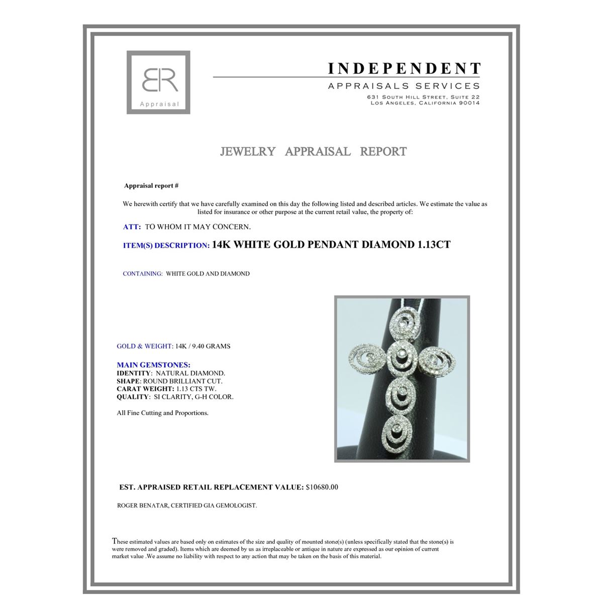 14K WHITE GOLD PENDANT 9.40GRAM DIAMOND 1.13CT
