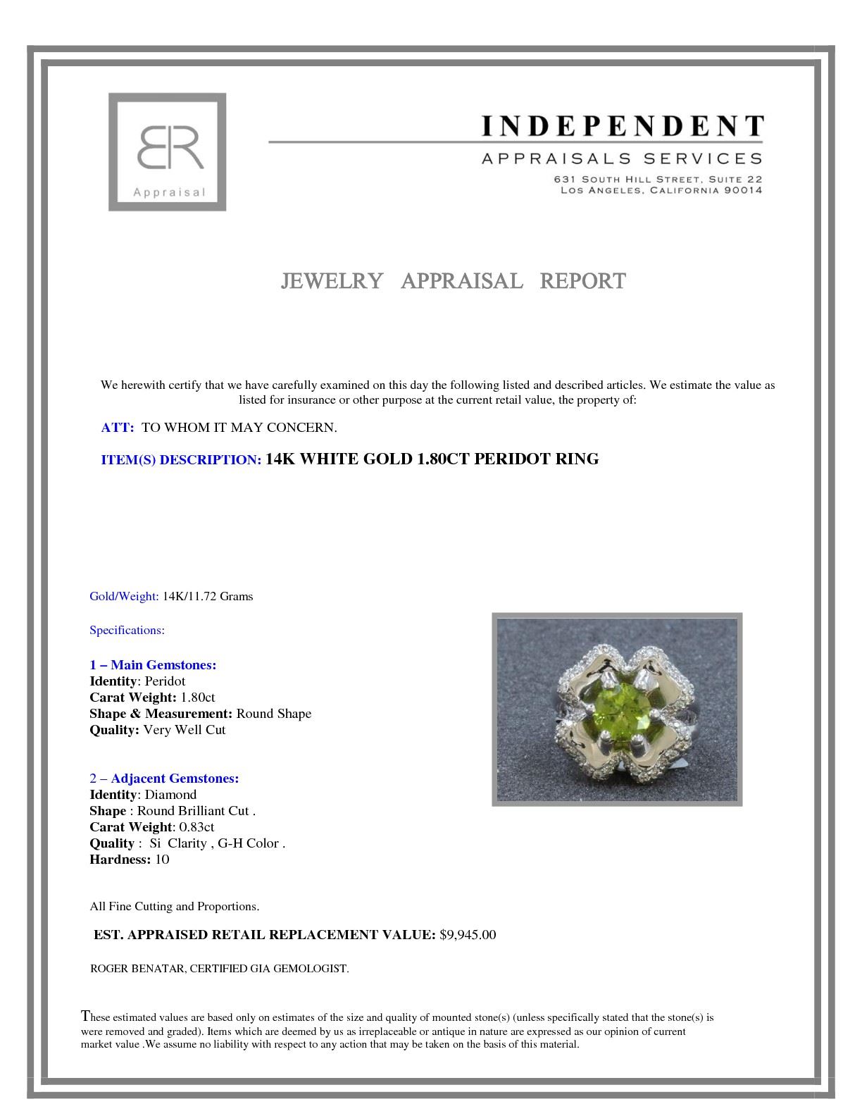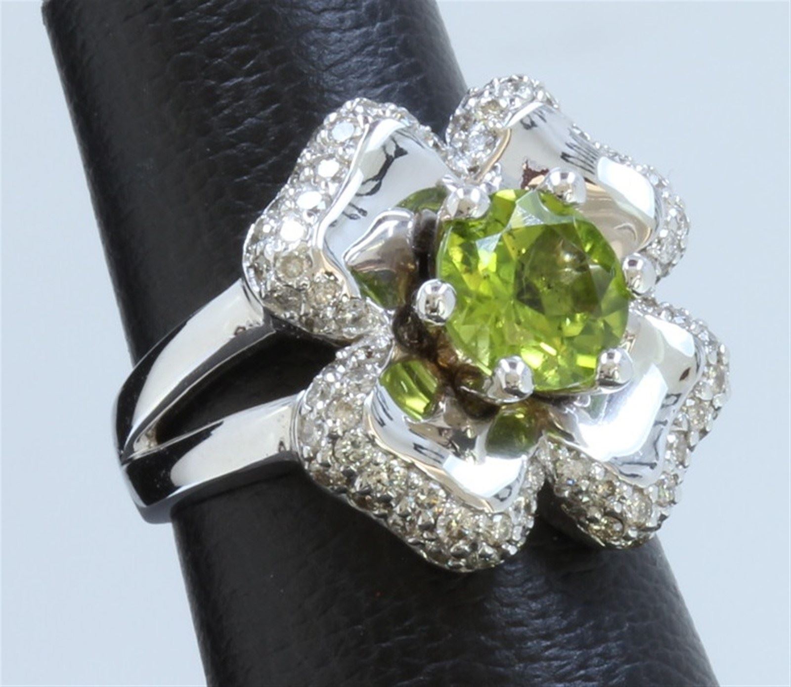 14K WHITE GOLD PERIDOT RING : 11.72g / Diamond: 0.83ct / Peridot: 1.8ct