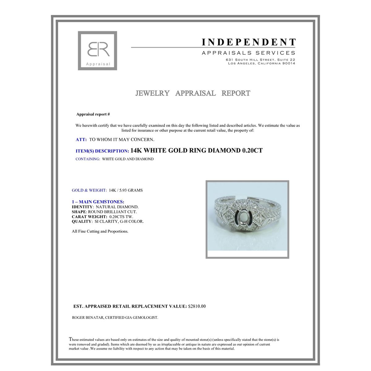 14K WHITE GOLD RING 5.93 GRAM DIAMOND 0.20CT SIDES