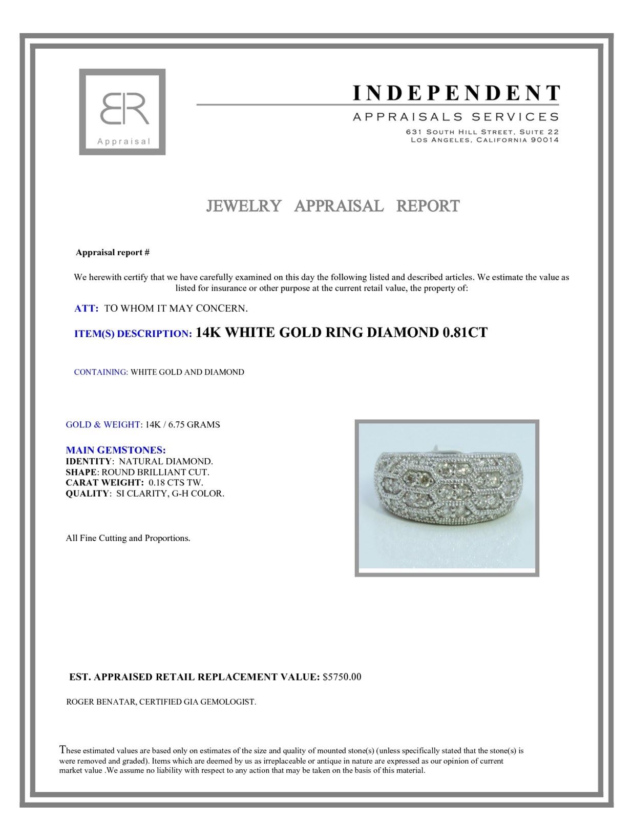 14K WHITE GOLD RING 6.75 GRAM DIAMOND 0.81CT