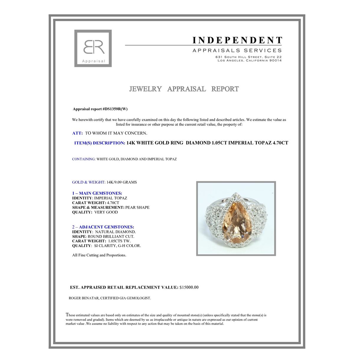 14K WHITE GOLD RING 9.09GRAM DIAMOND 1.05CT IMPERIAL TOPAZ 4.70CT