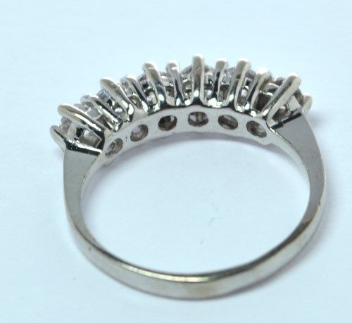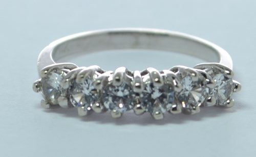 This ring is a fooler, it looks real and is very pretty, BUT the stones do not test as diamond. This ring is perfect for the "pay a little, look like a million bucks" category! Pre-owned.