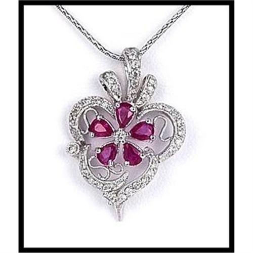 This charming pendant is sweet and memorable. The lovely natural rubies are brilliant and attention grabbing. The 5 rubies weigh .70 carats and are set in a 14K white gold diamond mounting. The 38 full cut diamonds weigh .30 carats weight and measures 27mm (1 1/16inches) x 18mm (23/32 inches).