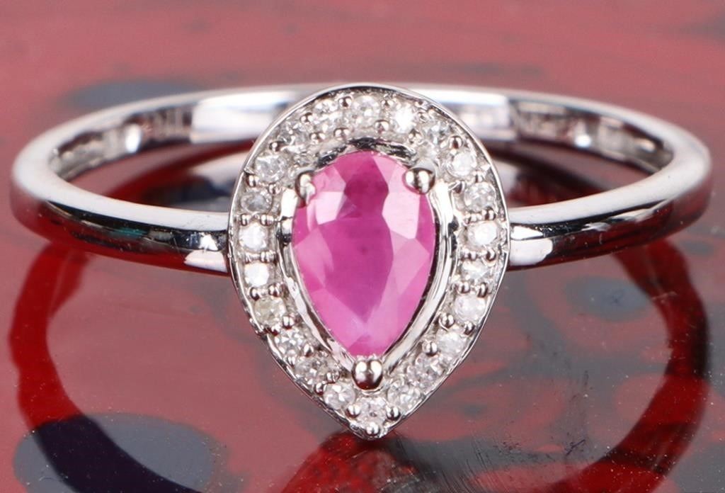 14K white gold ruby diamond ladies ring with one 0.40CT teardrop ruby and twenty-two 0.01CT round diamonds.