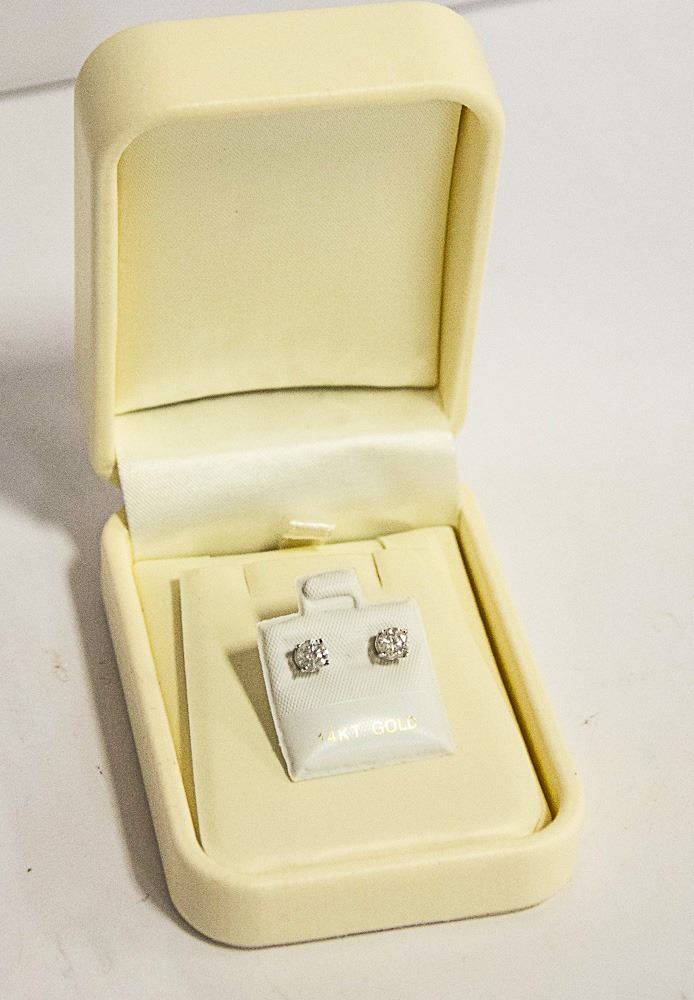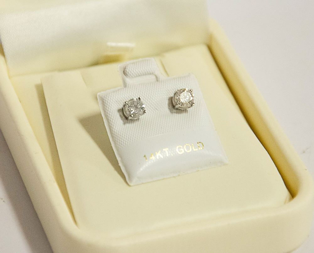 A 14 KARAT WHITE GOLD PAIR OF SINGLE STONE DIAMOND EAR STUDS. THE BRIGHT POLISHED FOUR PRONG SETTINGS SECURE, TWO ROUND BRILLIANT CUT DIAMONDS MEASURING, 4.43-4.50MM. CLARITY GRADE I 2-3. COLOUR GRADE G-I. TOTAL DIAMOND WEIGHT 0.76 CARAT. TOTAL WEIGHT 0.80 GRAM. SUGGESTED INSURANCE COVERAGE: $1600.00.