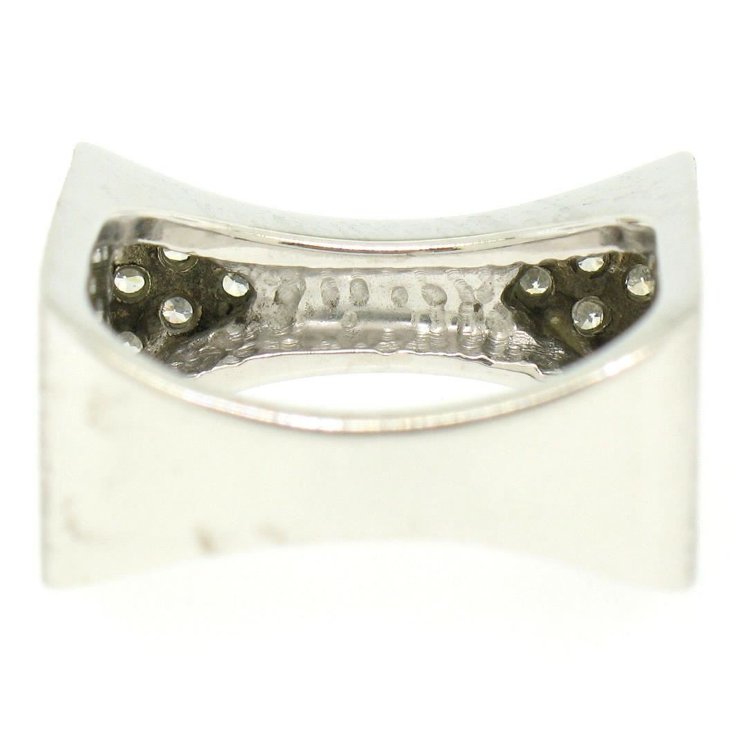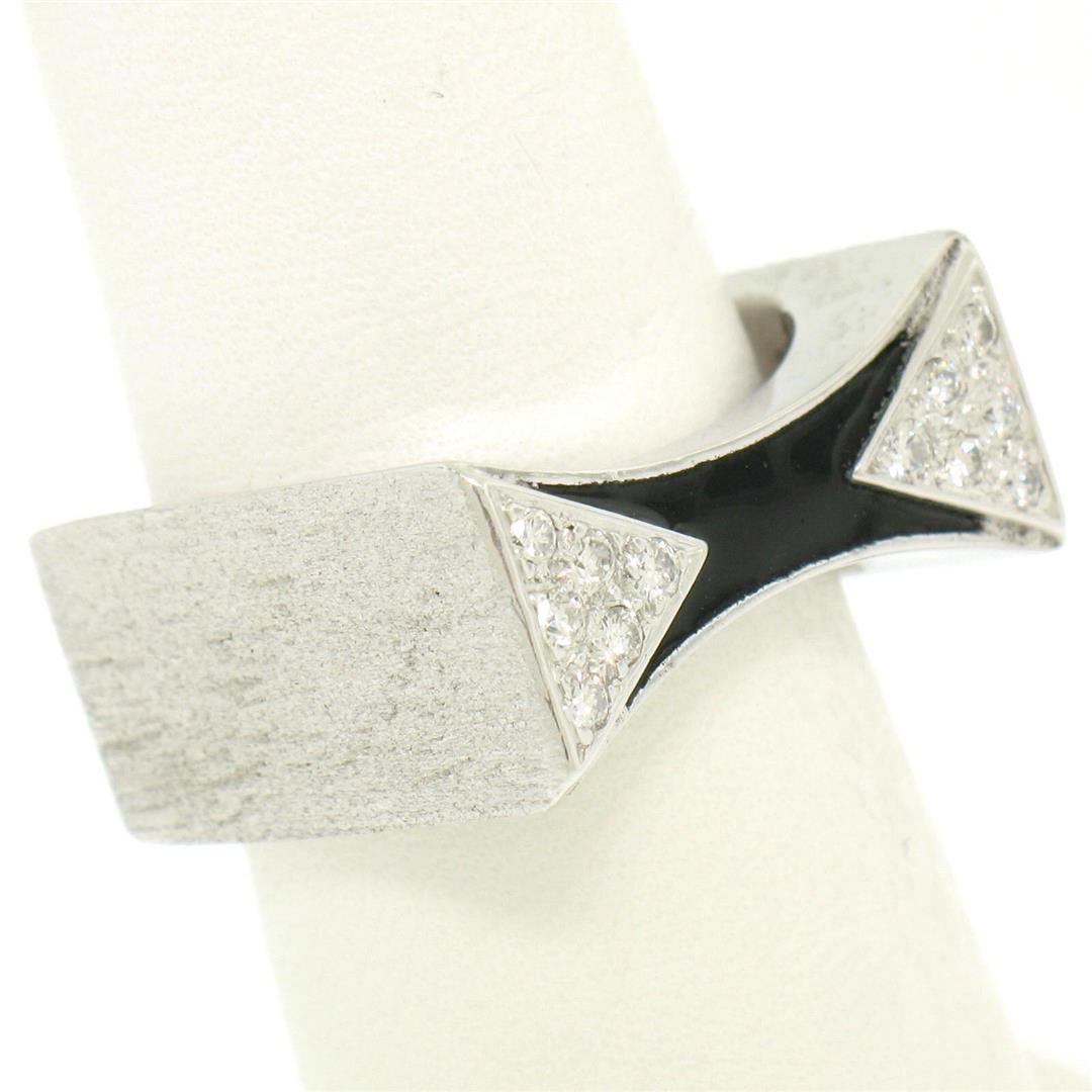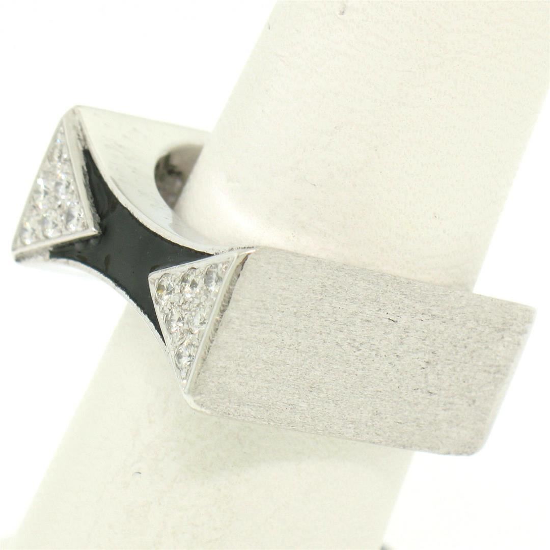 One 14K White Gold 0.30ctw Diamond & Black Enamel Stone Finished Squared Band Ring. Item Details: Material: 14k Solid White Gold, Weight: 11.9 Grams, Stone(s): (12) Natural Genuine Diamonds - Round Brilliant Cut - Prong Set - F Color - VS1 Clarity, Total Carat Weight: 0.30 (approx.), Ring Size: 7.0, Ring Width: 9.5mm, Ring Height: 3.5mm rise off the finger, Condition: Like New!