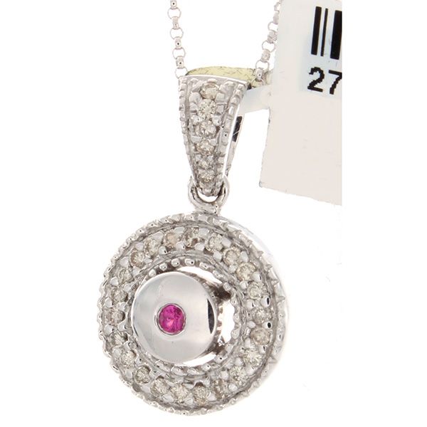 14K White Gold 0.45ctw Ruby & Diamond Pendant **|**|** 14K White Gold 0.45ctw Ruby & Diamond Pendant --- 28 Diamonds @0.4CT --- 1 Ruby @0.05CT --- Metal: 14K White Gold --- SKU#278207 *** ; MSRP: $3000