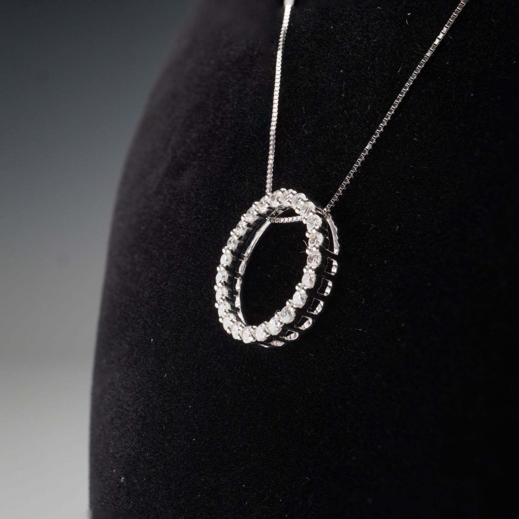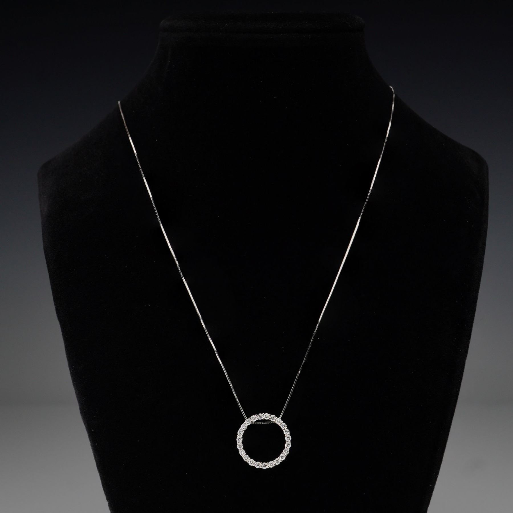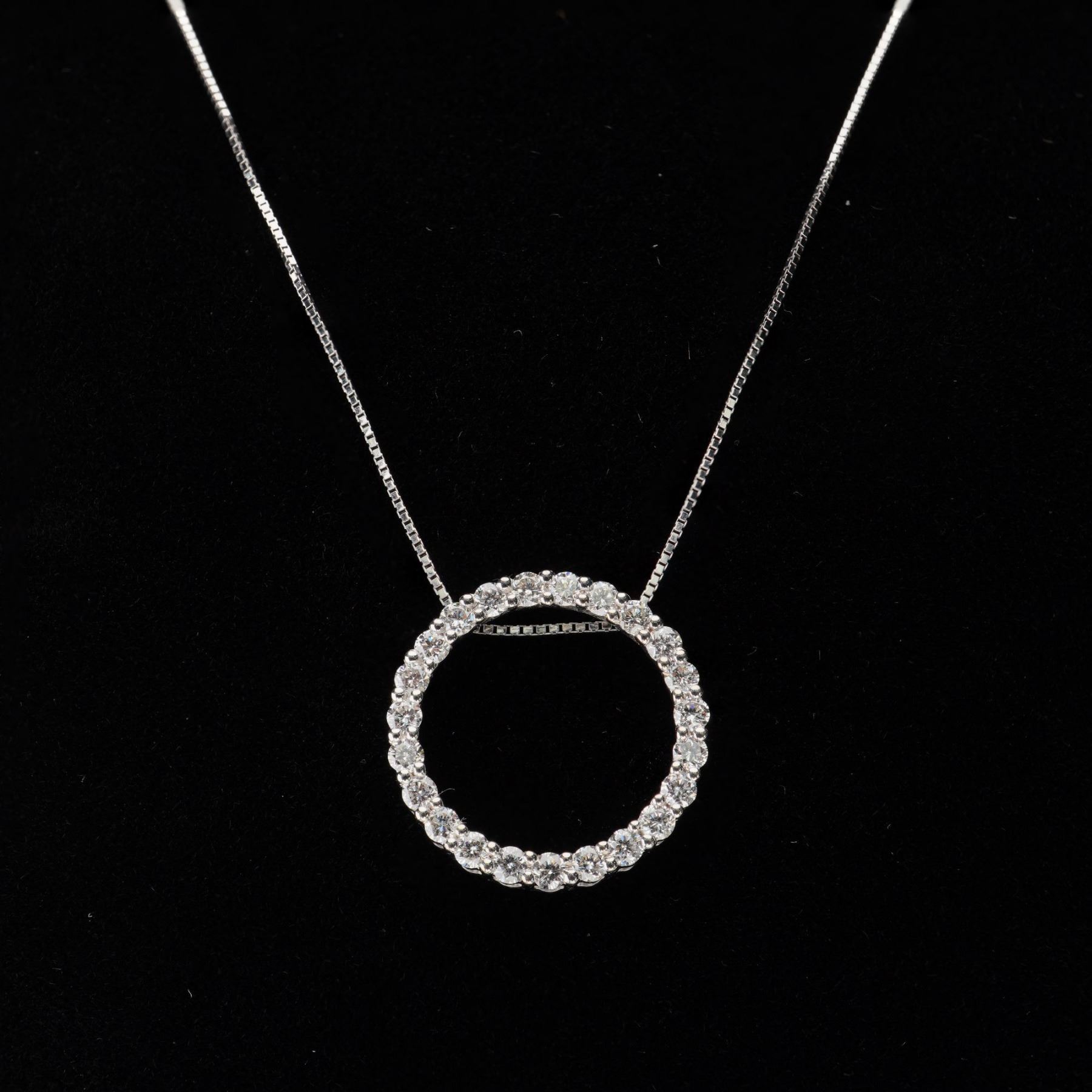 A refined 14K white gold necklace featuring a circular pendant set with round brilliant-cut white diamonds totaling approximately 0.51 carat. The pendant's open circle design showcases a continuous band of sparkling stones in a shared-prong setting. Suspended from a fine 14K white gold chain, this elegant piece offers a timeless look suitable for any occasion. Total combined weight: 2.28g.