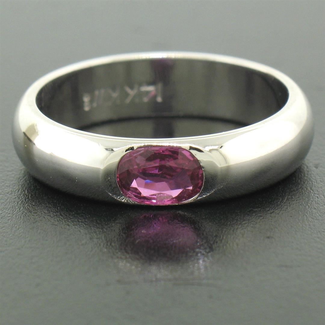 One 14K White Gold 0.62ct Oval Burnish Set Light Burgundy Ruby Solitaire Band Ring. Item Details - Material: 14K Solid White Gold, Weight: 5.5 Grams, Stone(s): (1) Natural Genuine Ruby - Oval Cut - Burnish Set - Rich Light Burgundy Color - 0.62ct (exact), Ring Size: 7.5 (We can custom size this ring.), Ring Width: 4.90mm, Ring Height: 1.95mm rise off the finger, Condition: New w/o Tag