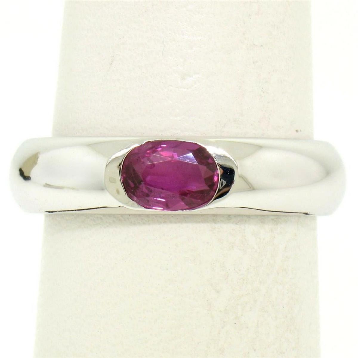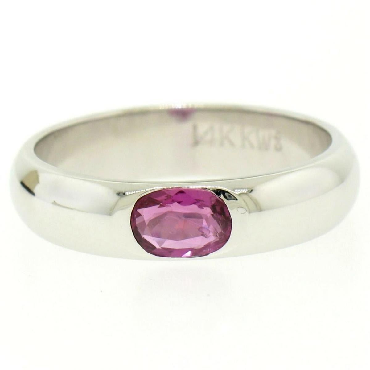 One 14K White Gold 0.62ct Oval Burnish Set Light Burgundy Ruby Solitaire Band Ring. Item Details - Material: 14K Solid White Gold, Weight: 5.5 Grams, Stone(s): (1) Natural Genuine Ruby - Oval Cut - Burnish Set - Rich Light Burgundy Color - 0.62ct (exact), Ring Size: 7.5 (We can custom size this ring.), Ring Width: 4.90mm, Ring Height: 1.95mm rise off the finger, Condition: New w/o Tag