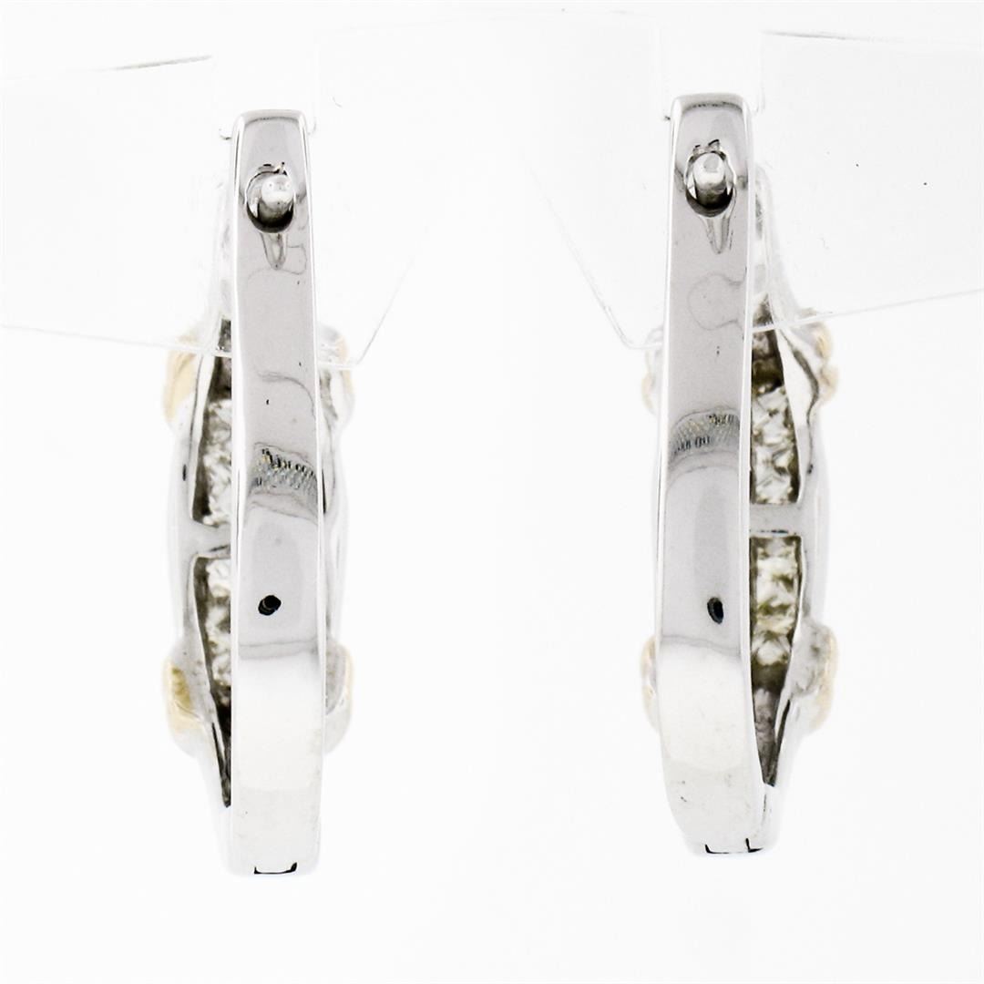 An estate solid 14k white and yellow gold huggie hoop earrings, with 20 princess cut natural diamonds (H/I - VS1/VS2 ; 0.75ctw). The earrings measure approximately 19.8x16.6mm and weigh a total of 5.5 grams.