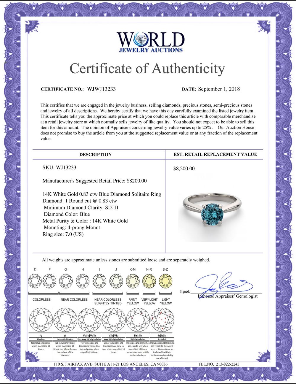 REF-153W4K - SKU: WJ13233 ---- 14K White Gold 0.83 ctw Blue Diamond Solitaire Ring