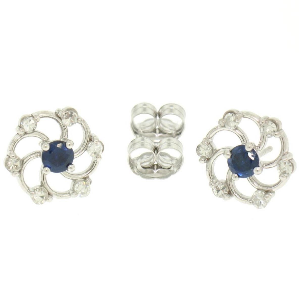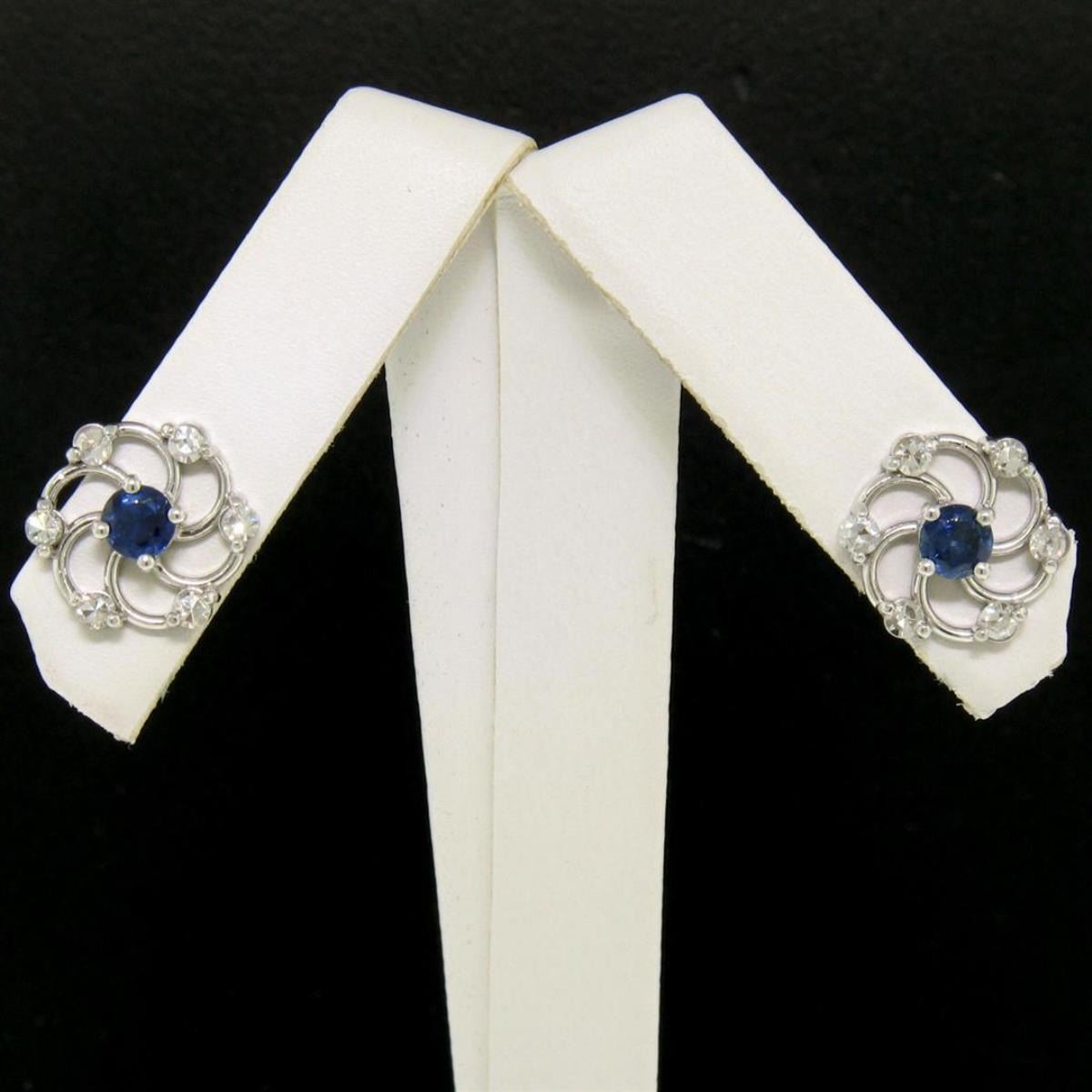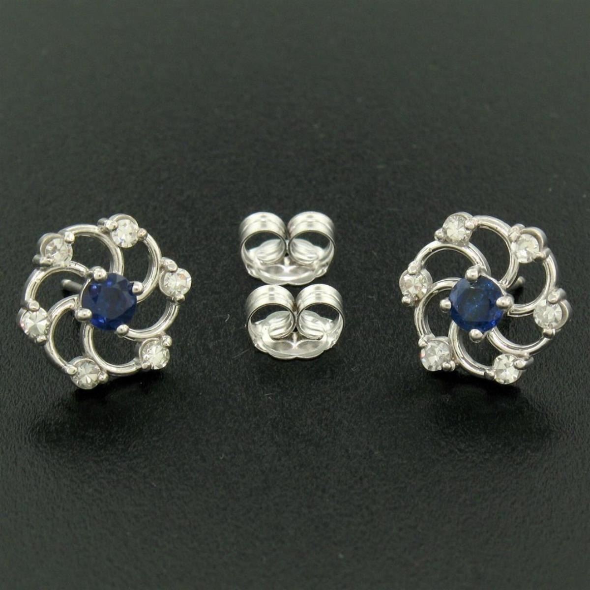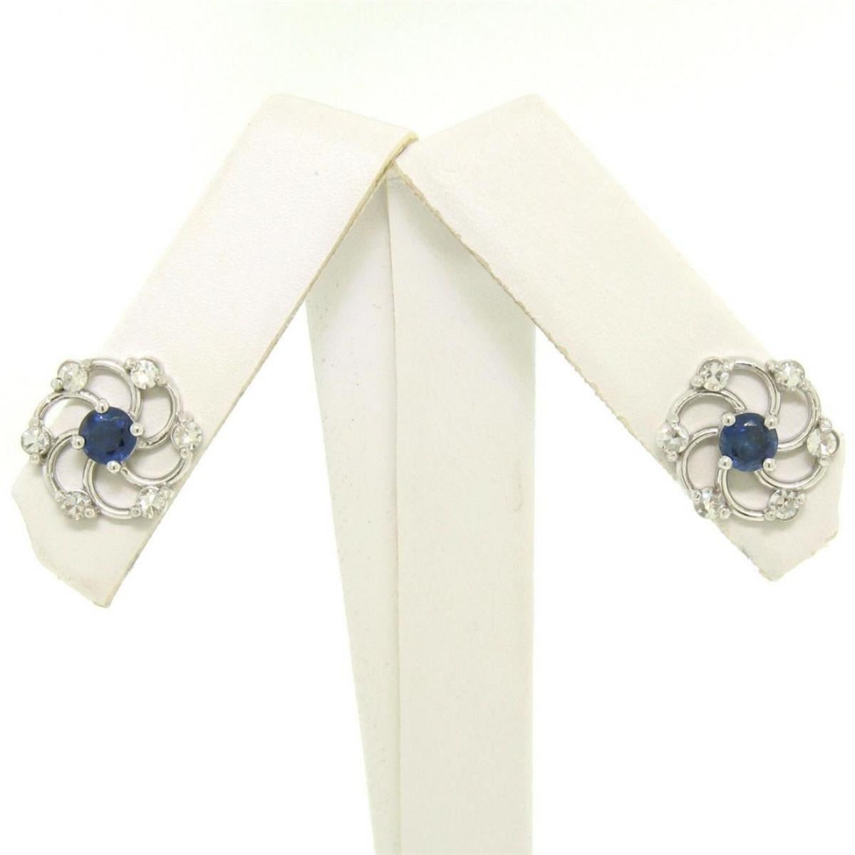 One Vintage 14K White Gold 1.0ctw Diamond & Sapphire Open Flower Design Stud Earring. Item Details - Material: 14k Solid White Gold, Weight: 2.3 Grams, Stone(s): (2) Natural Genuine Sapphire - Round Cut - Prong Set - Royal Blue Color - 0.60ctw (approx.), (12) Natural Genuine Diamonds - Single Cut - Prong Set - F/G Color - VS1 Clarity - 0.40ctw (approx.), Total Carat Weight: 1.00 (approx.), Backing: Post Backings w/ Butterfly Fastening , Width: 10.9mm, Thickness: 3.10mm, Condition: Vintage piece. Excellent condition!