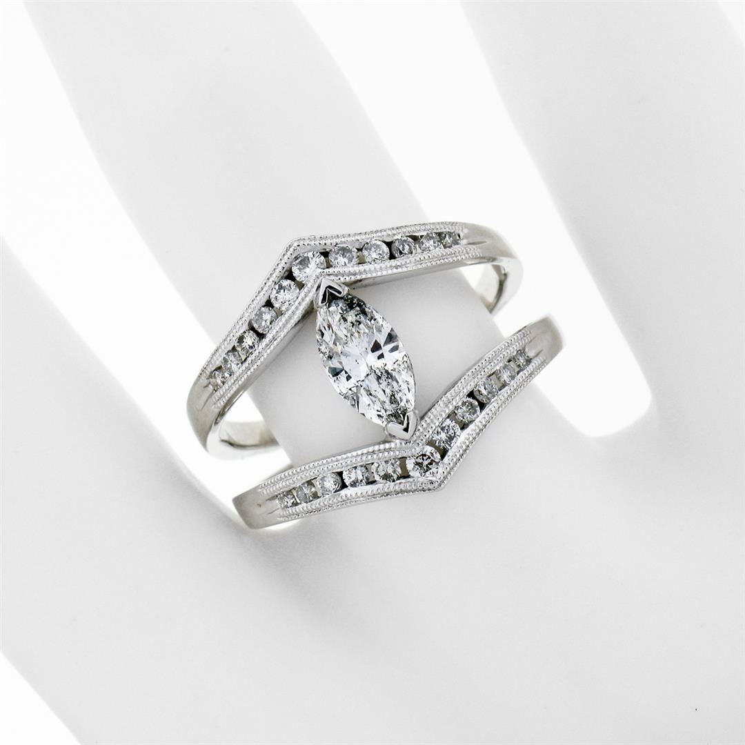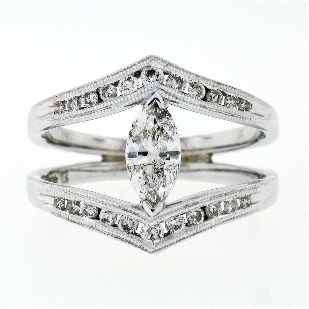 A new solid 14k white gold wide open split ring, with 1 marquise cut natural diamond (G- SI2; 0.55ct), and 22 round brilliant cut natural diamonds (G/H - SI1/SI2; 0.46ctw). The ring is size 6.5, weighs a total of 4.91 grams, and measures 15.50mm wide.