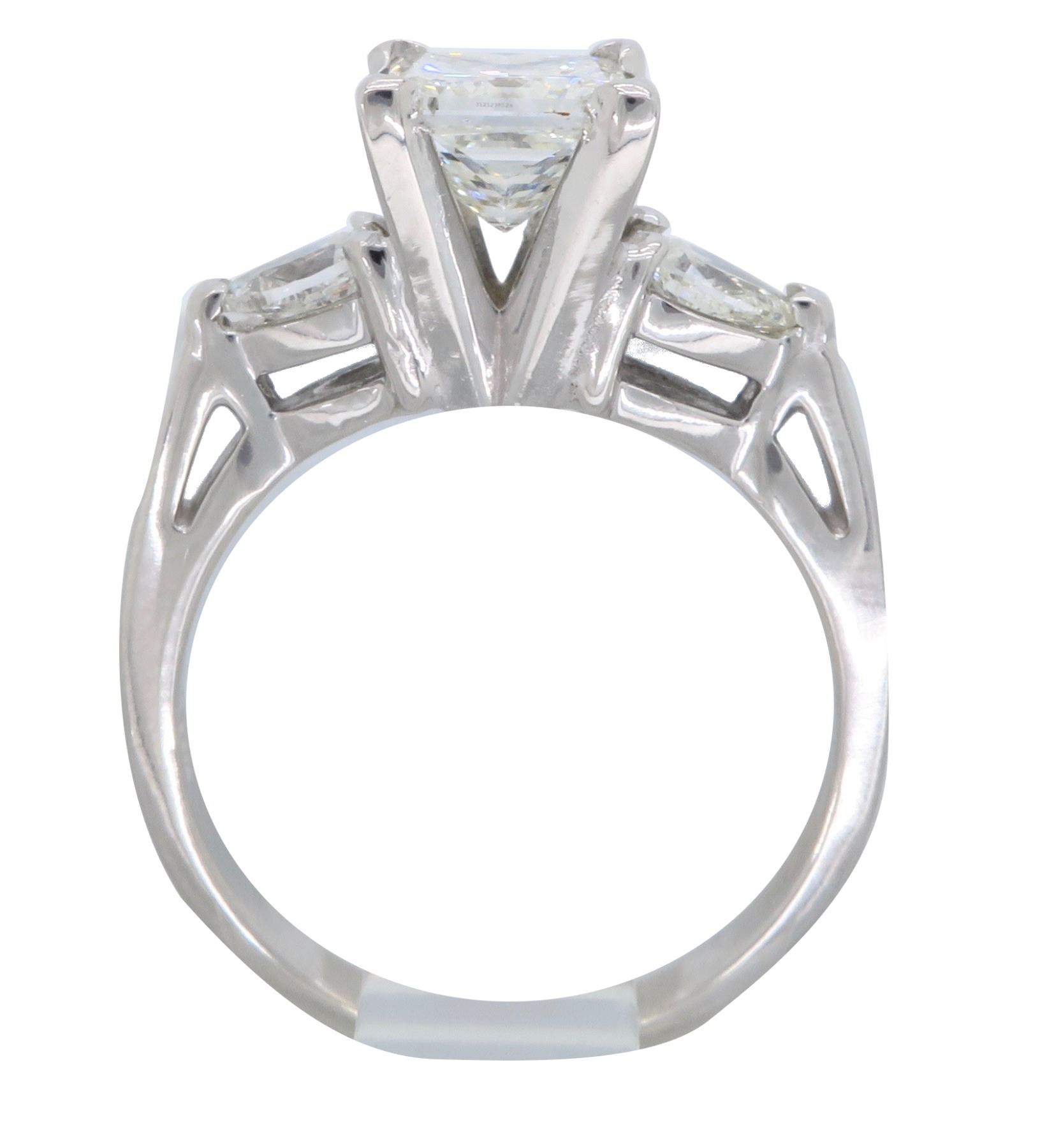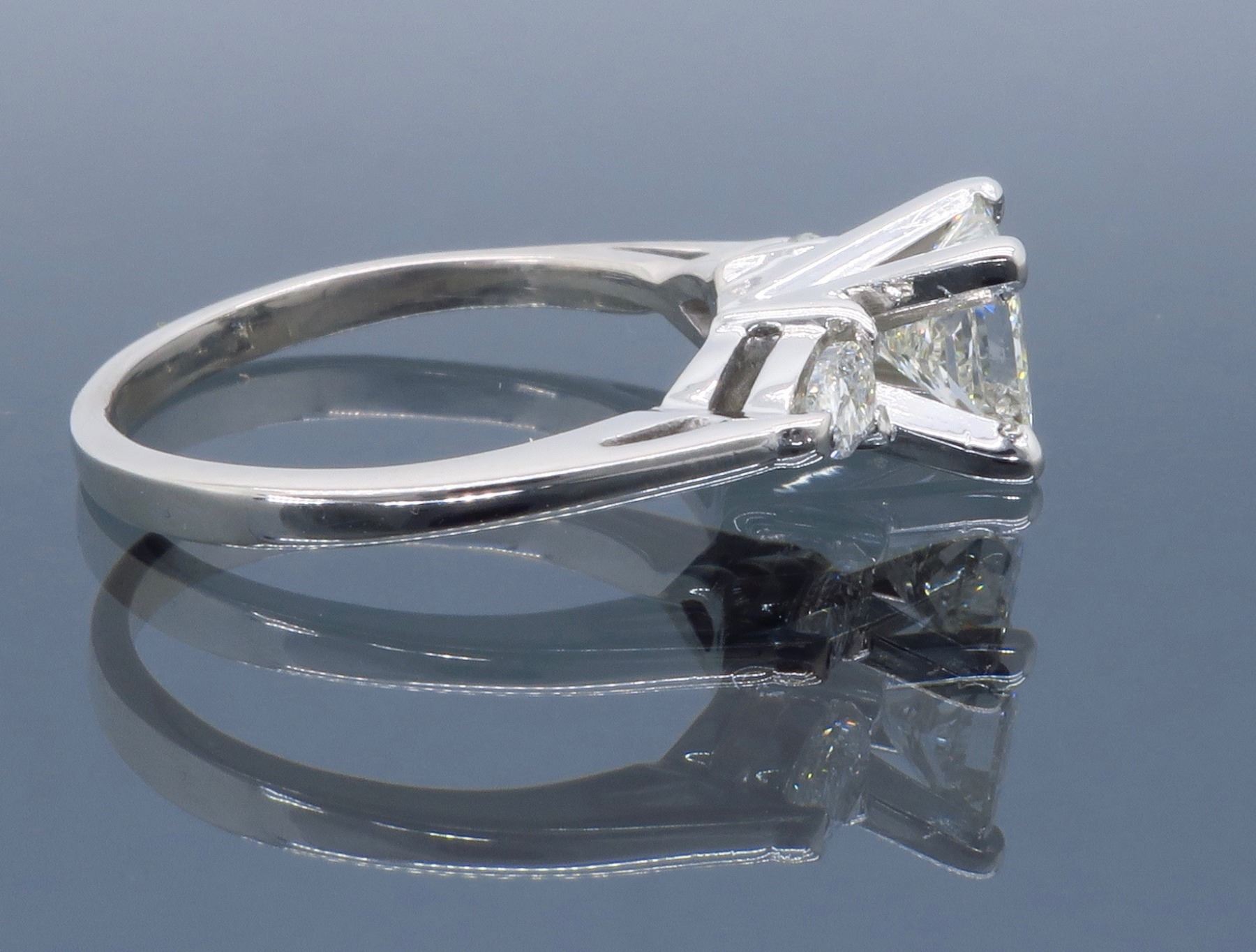 14K White Gold 1.01ctw Diamond Ring. (1) Princess cut Diamond with a total weight of 0.81cts with a color of H-I and clarity of VS-2 to SI-1. (2) side Diamonds with a total weight of 0.20cts. Total weight of this ring is 2.5 grams. Ring size is 3.75.