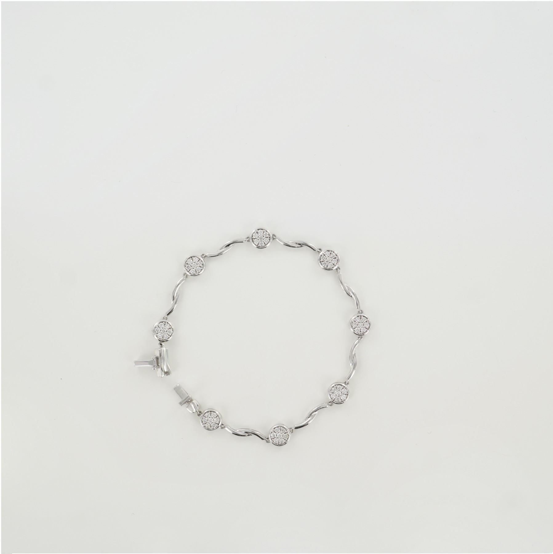 A stylish 14K white gold bracelet featuring round-cut white diamonds totaling approximately 1.03 carats. Each diamond cluster is securely bezel-set, connected by graceful curved links that add movement and shine. The piece is marked 14K and closes with a sturdy box clasp and safety latch for added security. A versatile bracelet with modern sparkle and classic craftsmanship. Weight: 7.00g.