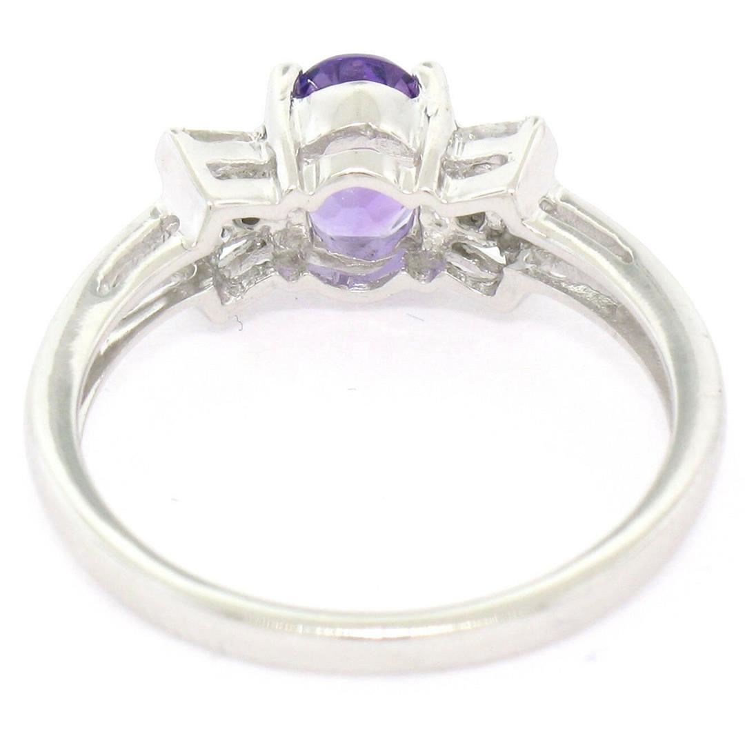 One NEW 14K White Gold 1.05ctw Oval Amethyst Solitaire Ring w/ 6 Diamond Accents. Item Details: Material: 14K Solid White Gold, Weight: 2.57 Grams, Stone(s): (1) Natural Genuine Amethyst - Oval Cut - Prong Set - Rich Purple Color - 7.05x5.15mm / 0.85ct (approx.), (2) Natural Genuine Diamonds - Round Brilliant Cut - Prong Set - F/G Color - SI1/SI2 Clarity - 0.04ctw (approx.), (4) Natural Genuine Diamonds - Baguette Cut - Channel Set - G/H Color - SI1/SI2 Clarity - 0.16ctw (approx.), Total Carat Weight: 1.05 (approx.), Ring Size: 6.5, Ring Width: 7.05mm. Ring Height: 5.55mm rise off the finger. Condition: New w/o Tag