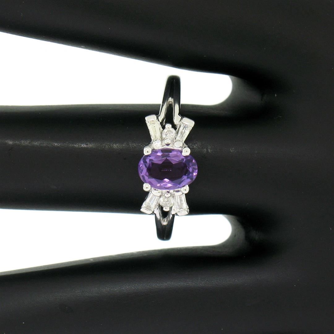 One NEW 14K White Gold 1.05ctw Oval Amethyst Solitaire Ring w/ 6 Diamond Accents. Item Details: Material: 14K Solid White Gold, Weight: 2.57 Grams, Stone(s): (1) Natural Genuine Amethyst - Oval Cut - Prong Set - Rich Purple Color - 7.05x5.15mm / 0.85ct (approx.), (2) Natural Genuine Diamonds - Round Brilliant Cut - Prong Set - F/G Color - SI1/SI2 Clarity - 0.04ctw (approx.), (4) Natural Genuine Diamonds - Baguette Cut - Channel Set - G/H Color - SI1/SI2 Clarity - 0.16ctw (approx.), Total Carat Weight: 1.05 (approx.), Ring Size: 6.5, Ring Width: 7.05mm. Ring Height: 5.55mm rise off the finger. Condition: New w/o Tag