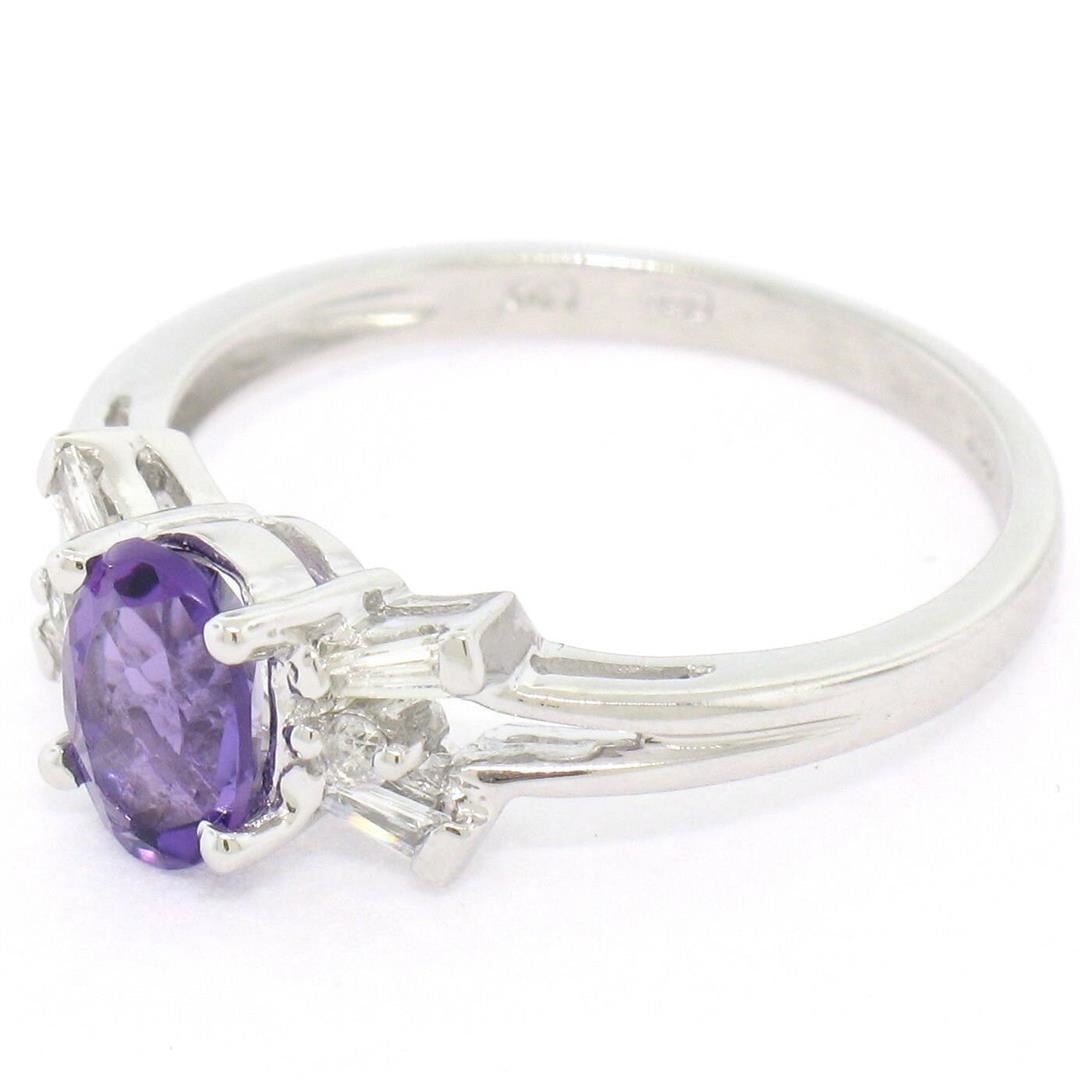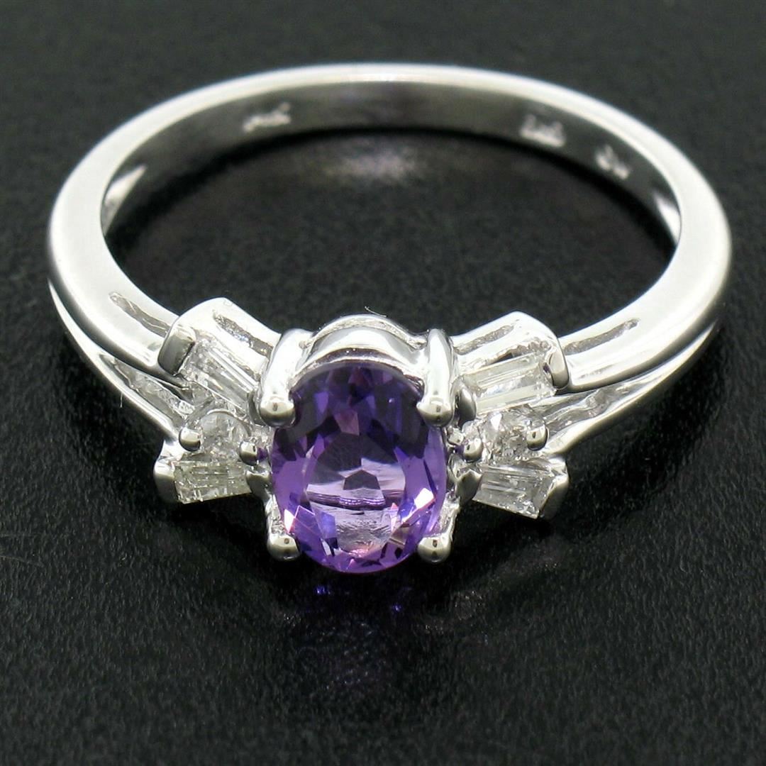 One NEW 14K White Gold 1.05ctw Oval Amethyst Solitaire Ring w/ 6 Diamond Accents. Item Details: Material: 14K Solid White Gold, Weight: 2.57 Grams, Stone(s): (1) Natural Genuine Amethyst - Oval Cut - Prong Set - Rich Purple Color - 7.05x5.15mm / 0.85ct (approx.), (2) Natural Genuine Diamonds - Round Brilliant Cut - Prong Set - F/G Color - SI1/SI2 Clarity - 0.04ctw (approx.), (4) Natural Genuine Diamonds - Baguette Cut - Channel Set - G/H Color - SI1/SI2 Clarity - 0.16ctw (approx.), Total Carat Weight: 1.05 (approx.), Ring Size: 6.5, Ring Width: 7.05mm. Ring Height: 5.55mm rise off the finger. Condition: New w/o Tag