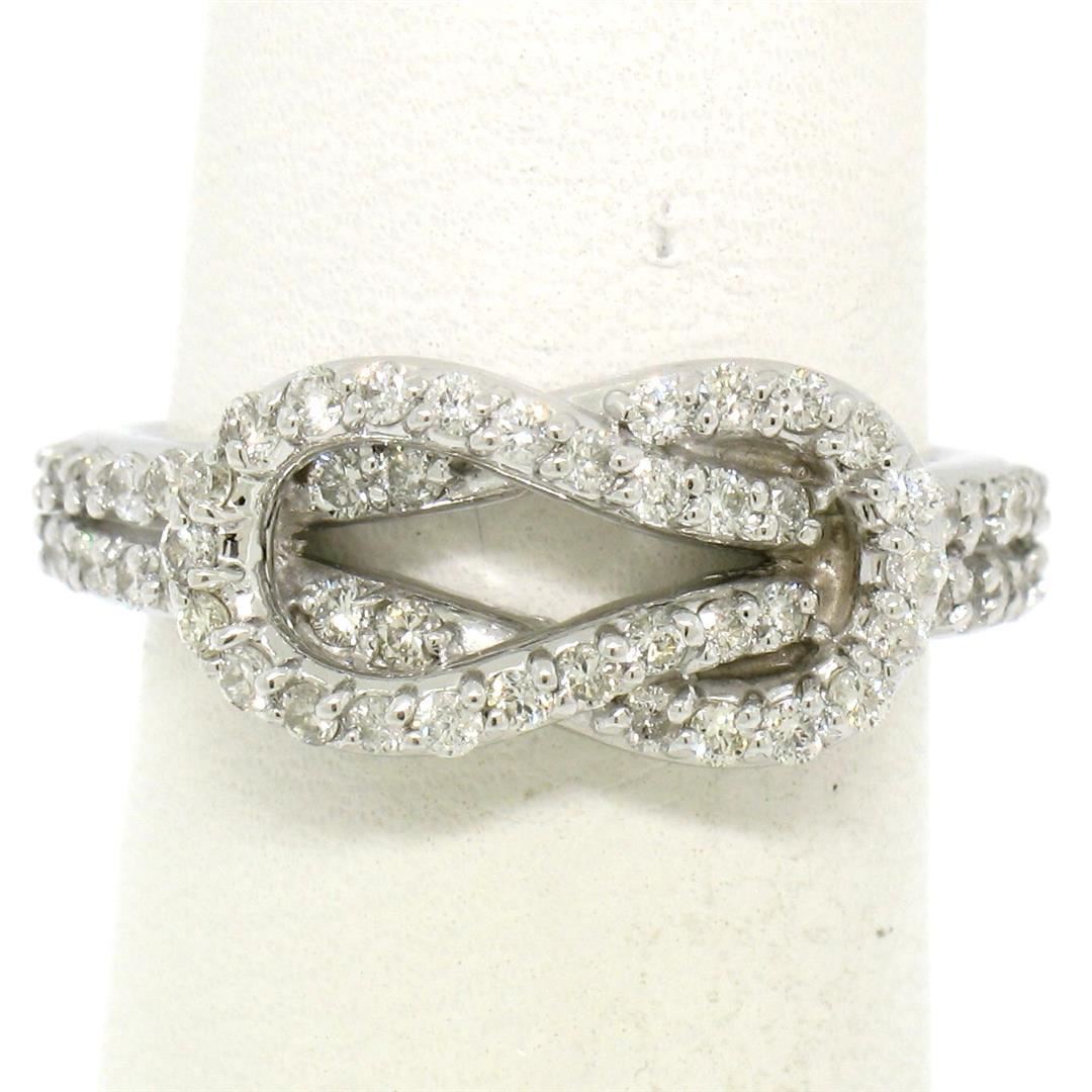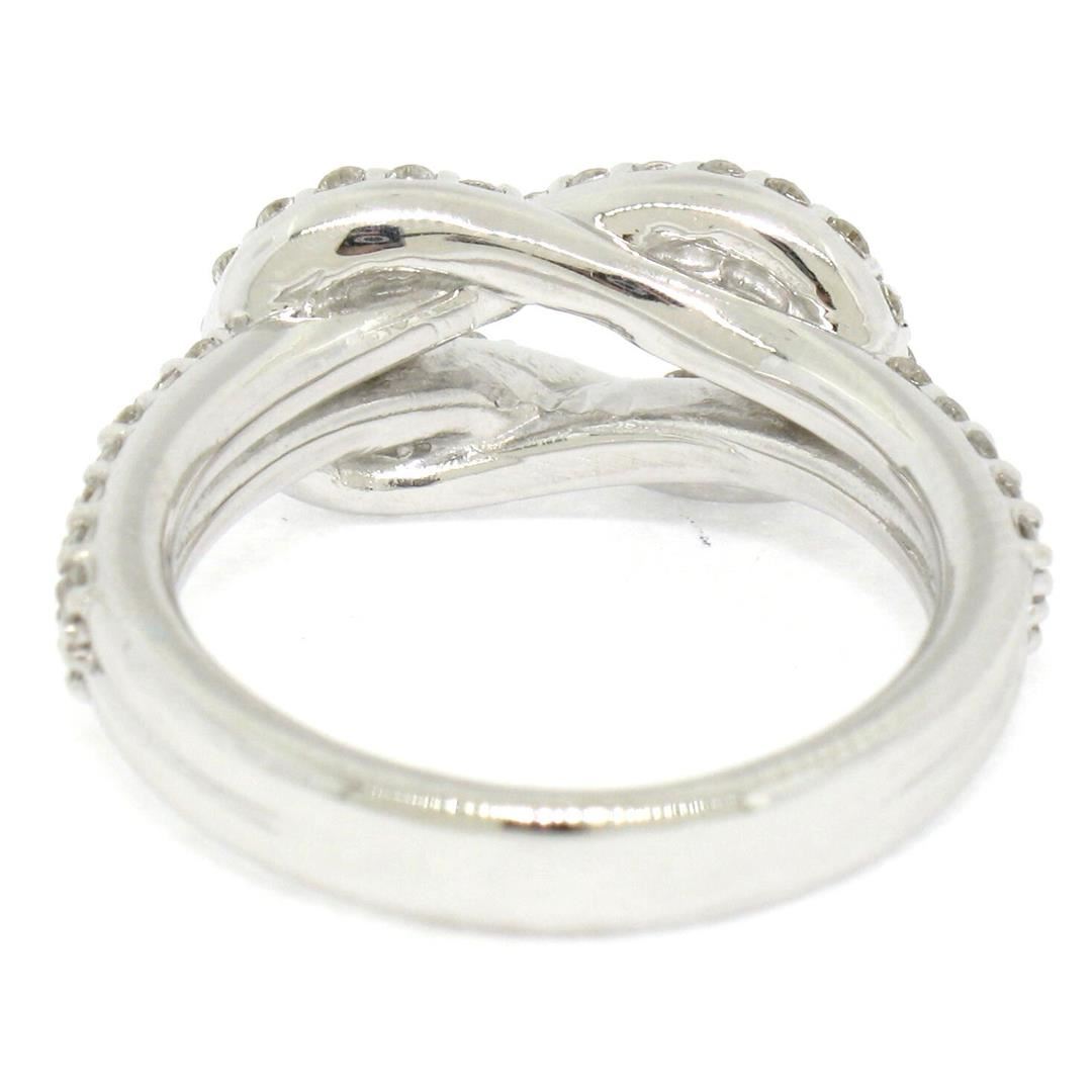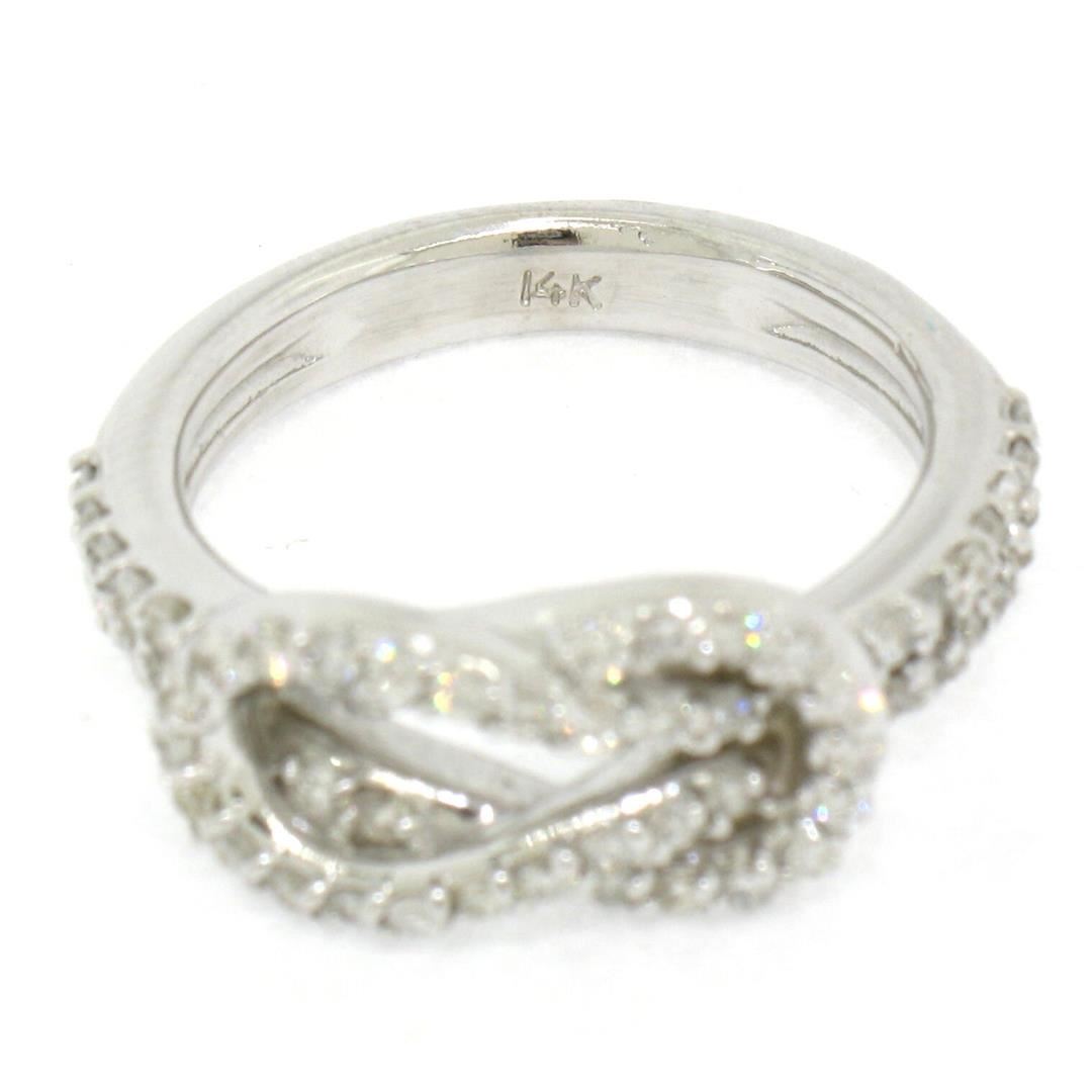 14K White Gold 1.05ctw Round Brilliant Diamond Interlocking Loop Love Knot Ring. Please see photos and description for all available information. An estate solid 14k white gold love knot ring, featuring 60 round brilliant cut natural diamonds (F/G- VS2/SI1; 1.05ctw). The ring is size 5.5, weighs a total of 5.84 grams, and measures 8.30mm wide.