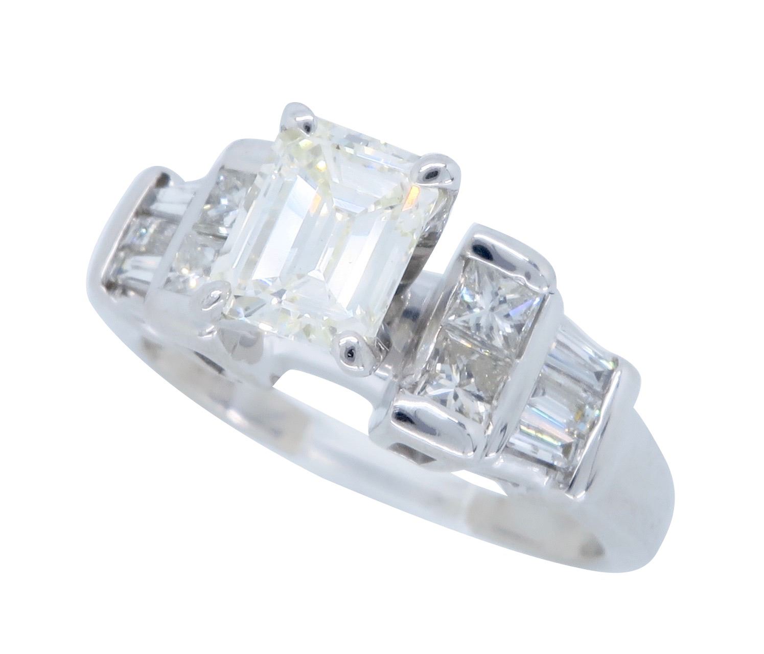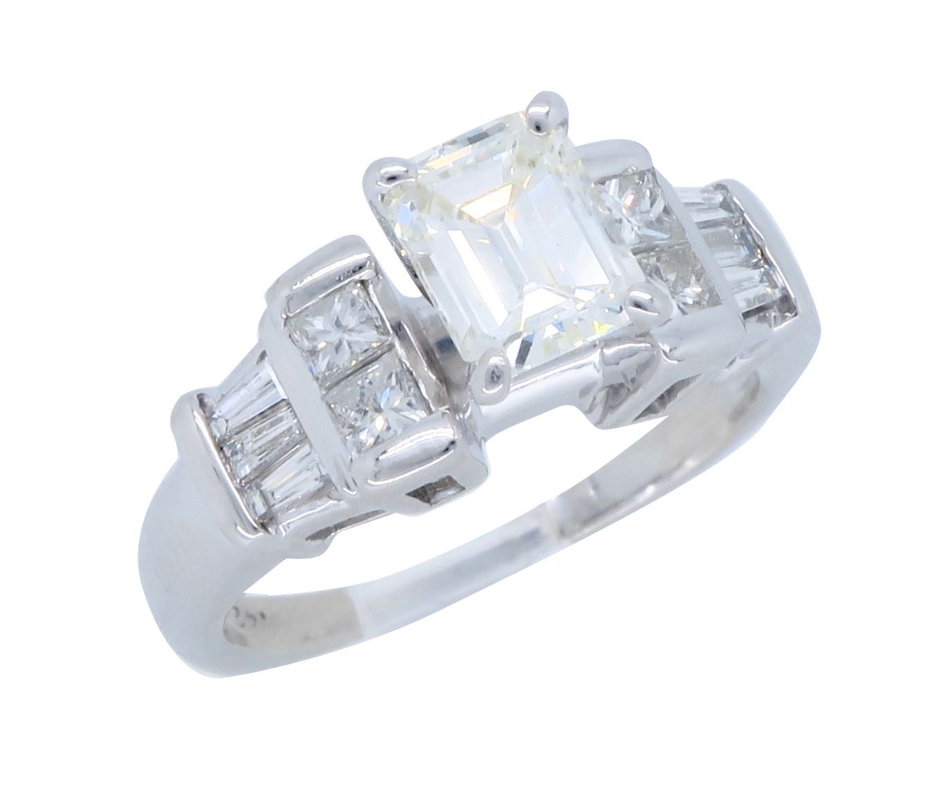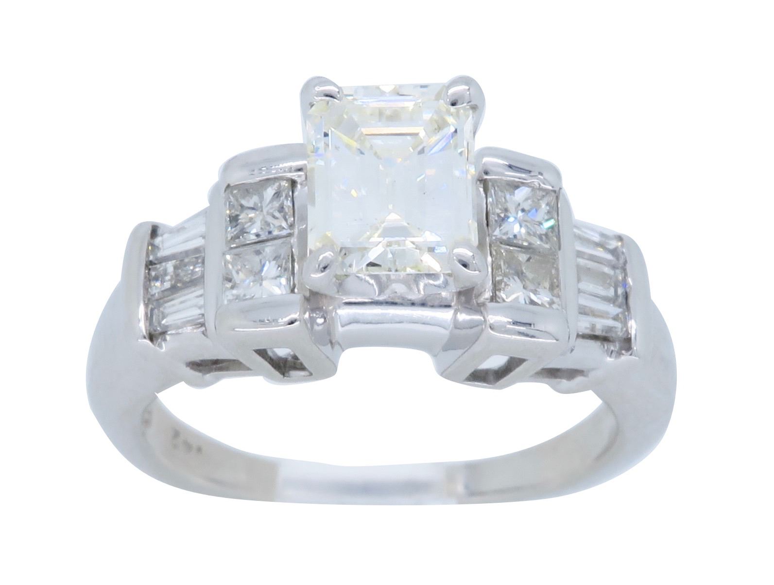 One 14K White Gold 1.07ctw Diamond Ring. (1) Emerald cut Diamond with a total weight of 0.65cts with a color of J and clarity of VS-2. Side round Diamonds with a total weight of 0.42cts. Total weight of this ring is 4.3 grams.