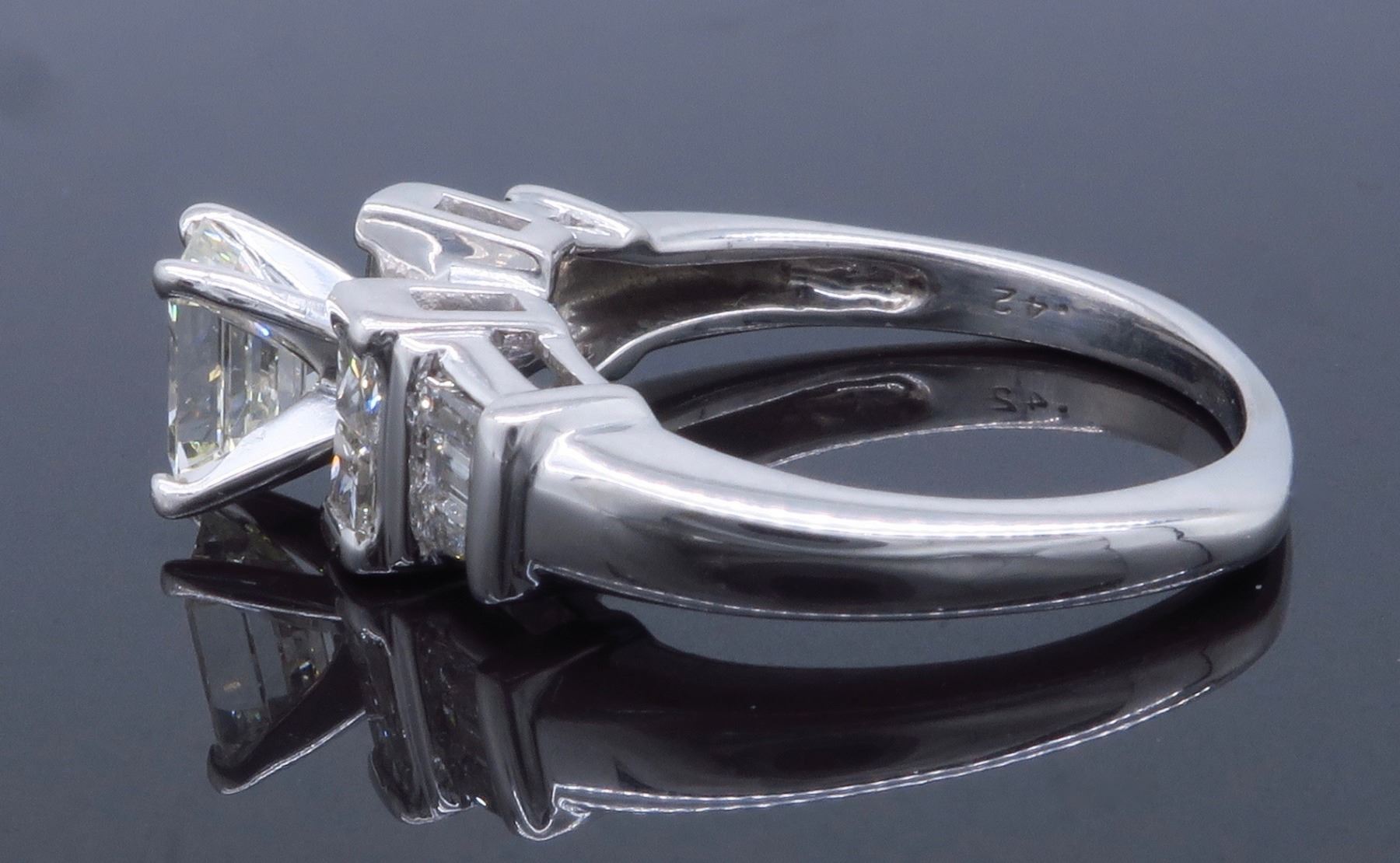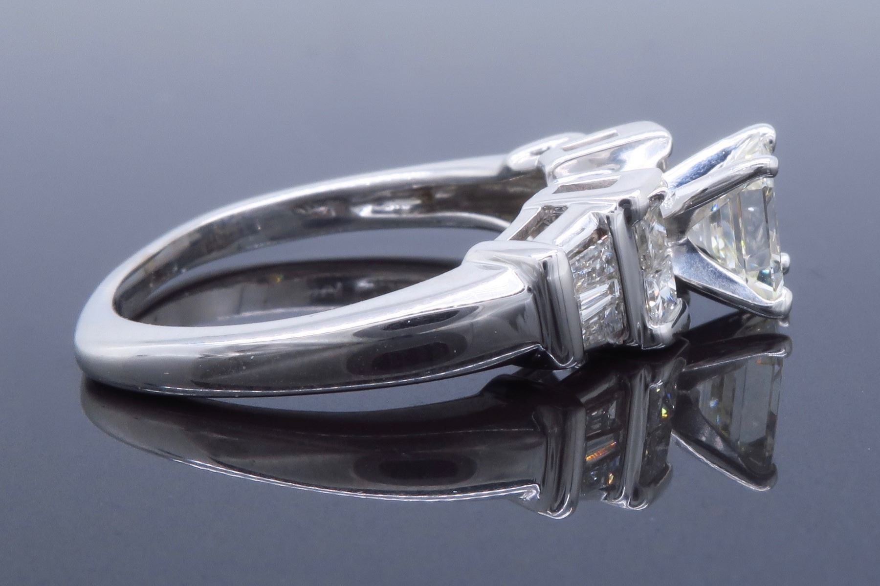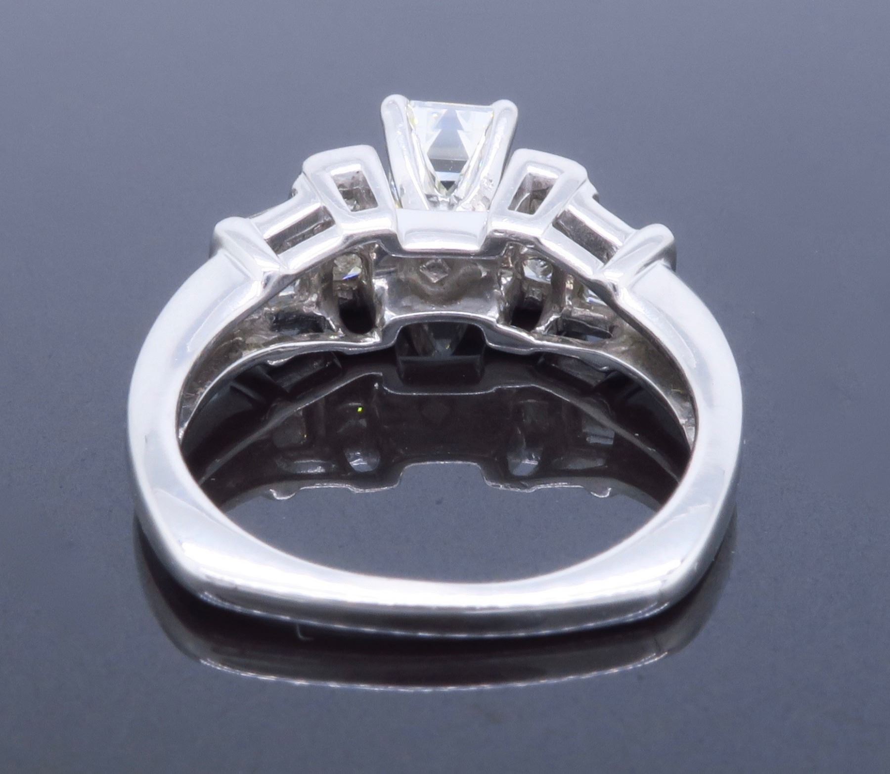 One 14K White Gold 1.07ctw Diamond Ring. (1) Emerald cut Diamond with a total weight of 0.65cts with a color of J and clarity of VS-2. Side round Diamonds with a total weight of 0.42cts. Total weight of this ring is 4.3 grams.