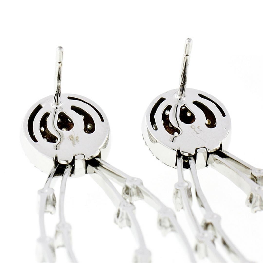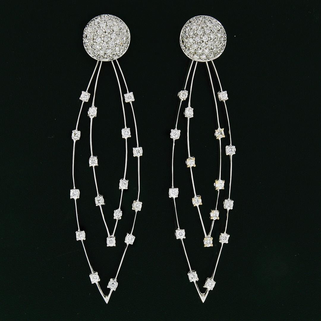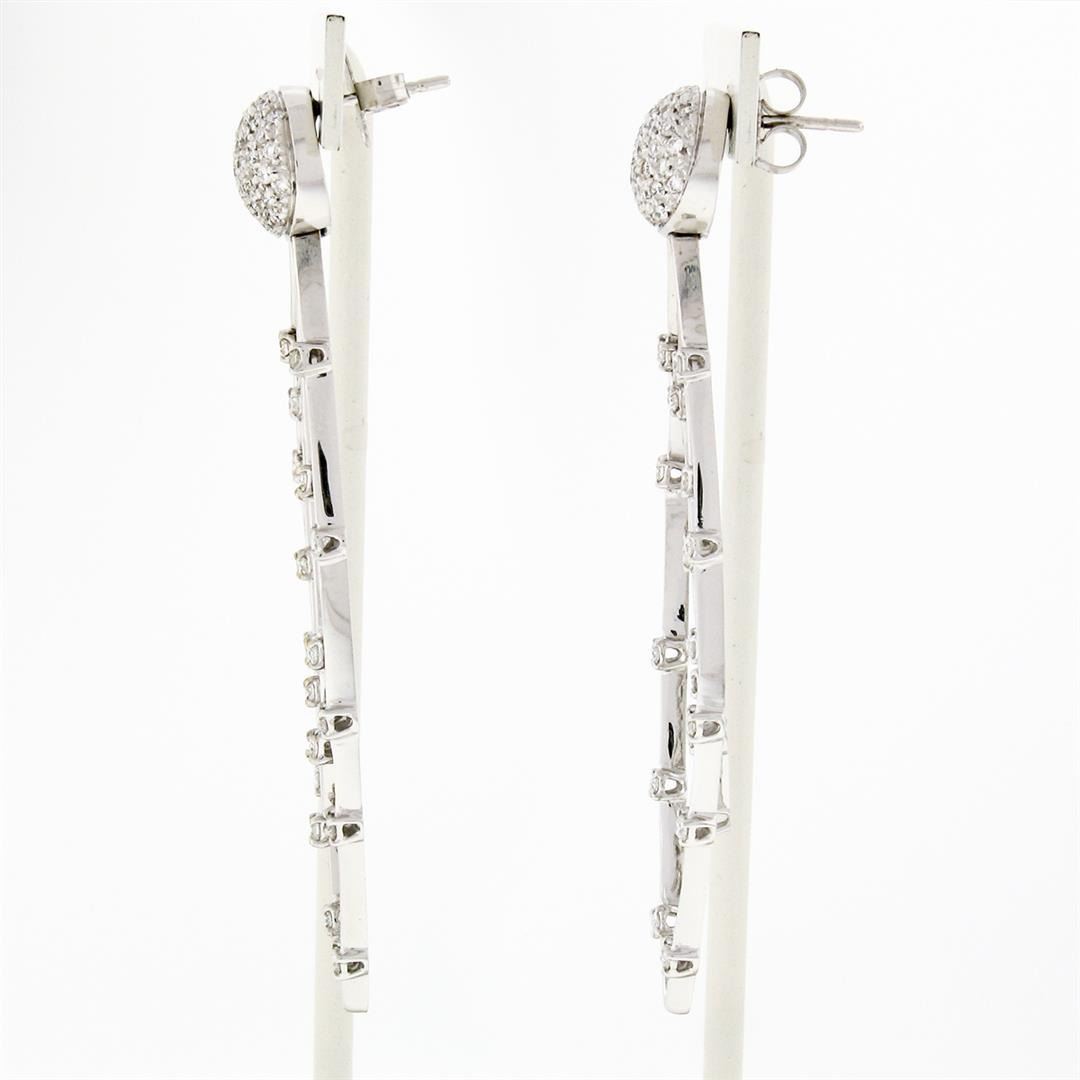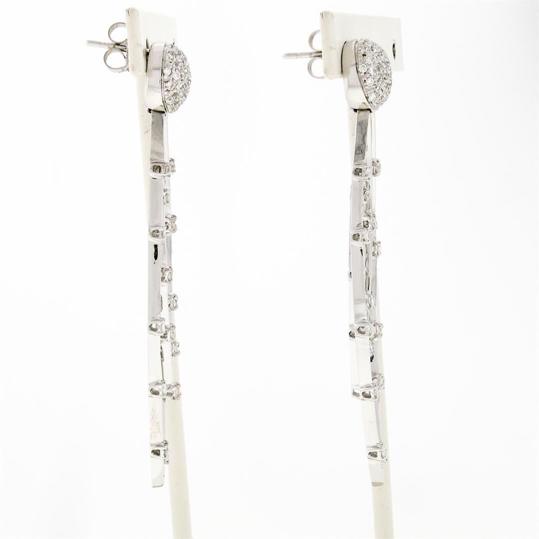 An estate solid 14k white gold swing dangle earrings, with 105 round brilliant cut natural diamonds (F/G - VS1/VS2; 1.30ctw). The earrings measure approximately 68.35x17mm and weigh a total of 14.73 grams.