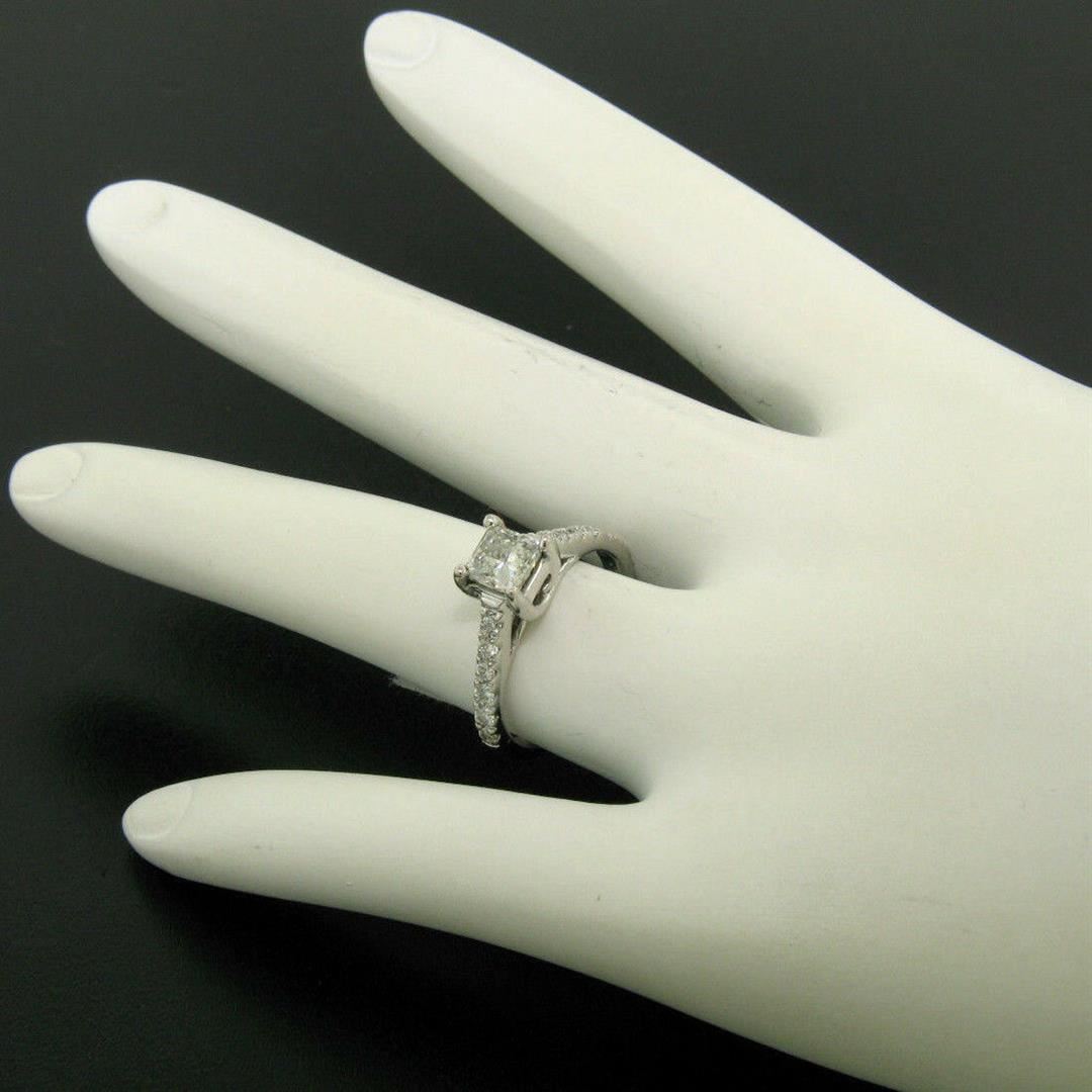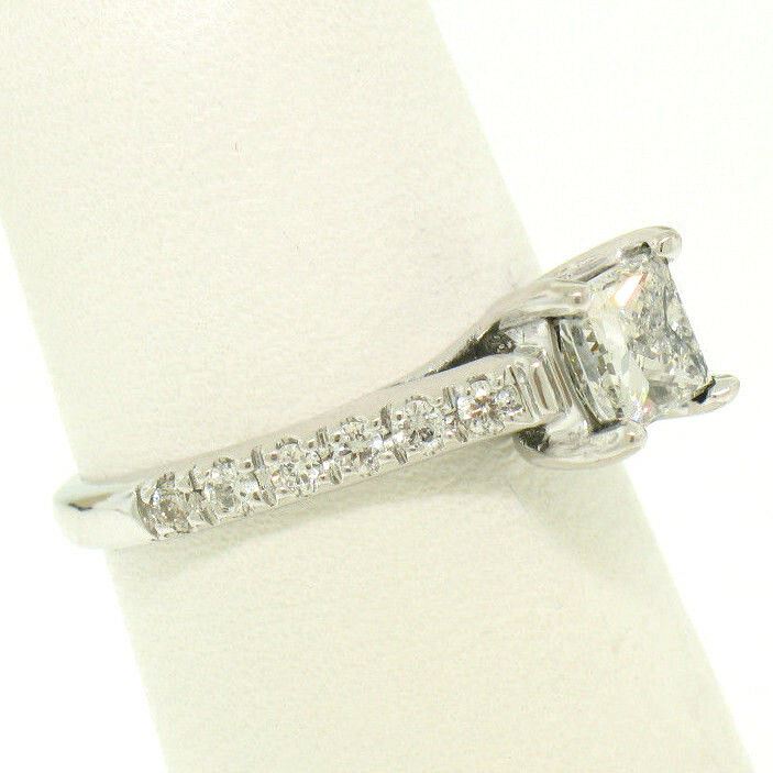 One 14K White Gold 1.32ctw H VS1 Prong Set Princess Cut Diamond Engagement Ring Size 5. Item Details: Material: 14K Solid White Gold, Weight: 2.70 Grams, Stone(s): (1) Natural Genuine Diamond - Princess Cut - Prong Set - H Color - VS1 Clarity - 0.60ct (approx.), (12) Natural Genuine Diamonds - Round Brilliant Cut - Pave Set - G Color - VS1/VS2 Clarity - 0.72ctw (stamped), Total Carat Weight: 1.32 (approx.), Ring Size: 5.0 (We can custom size this ring.), Ring Width: 6.03mm, Ring Height: 6.60mm rise off the finger Condition: Like new!