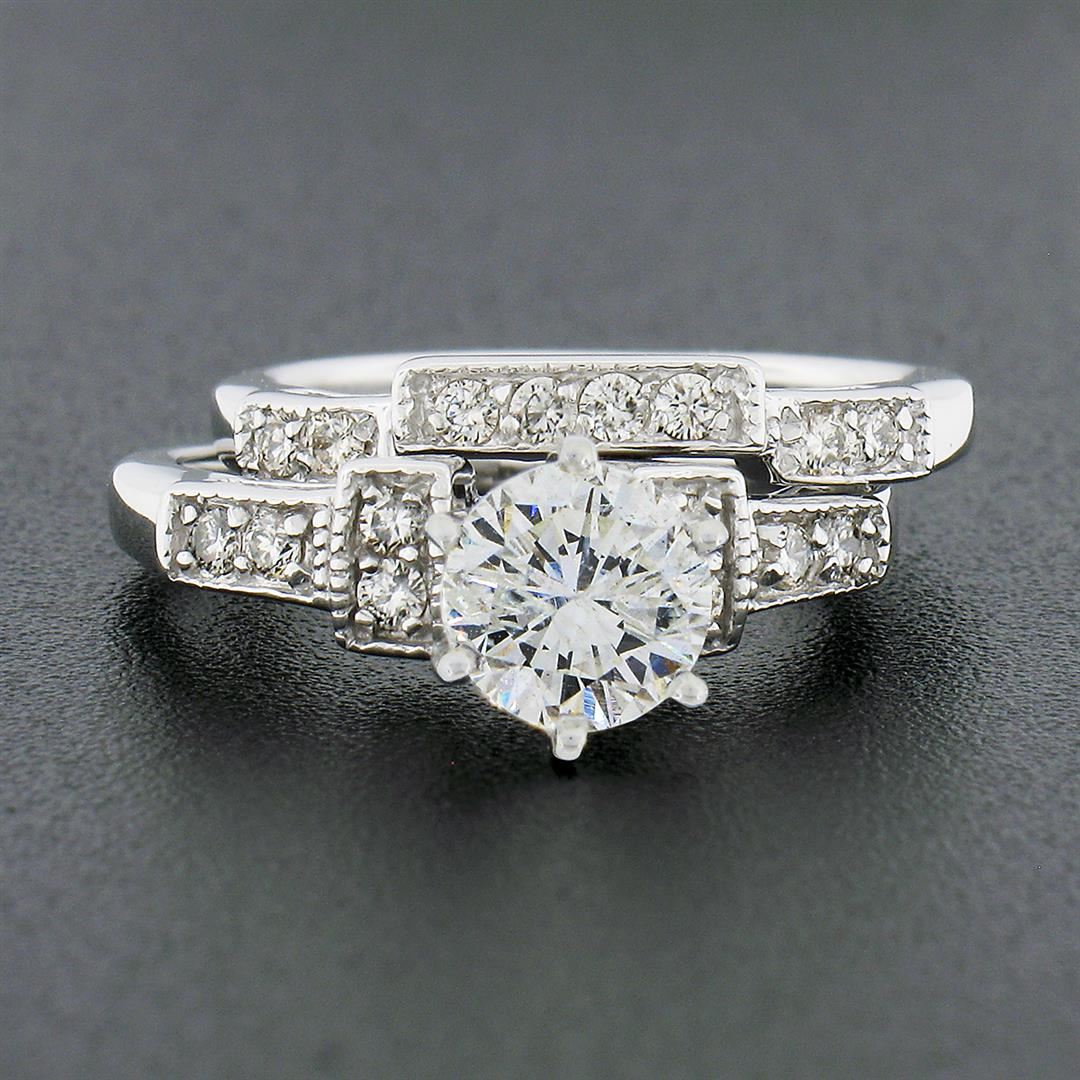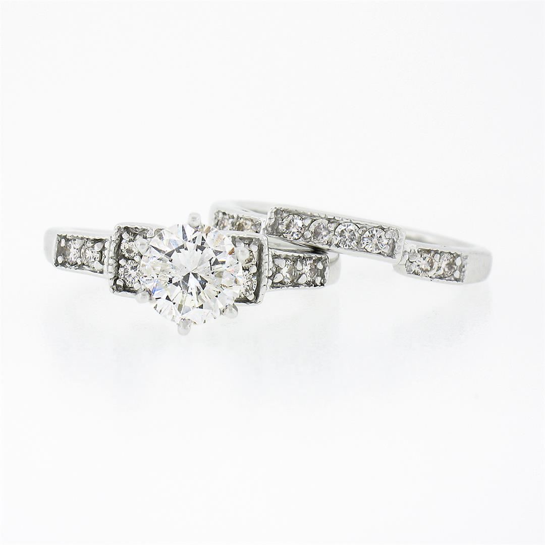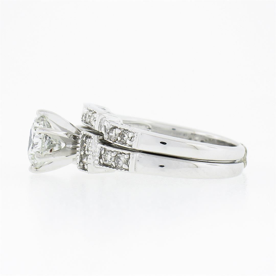 A solid 14k white gold engagement ring and wedding band set, with 1 round brilliant cut natural diamond (H - I1 ; 1.08ct), and 16 round brilliant cut natural diamonds (G/H - SI1/SI2 ; 0.30ctw). The ring is size 4.5, weighs a total of 4.80 grams, and measures 7.60mm wide.