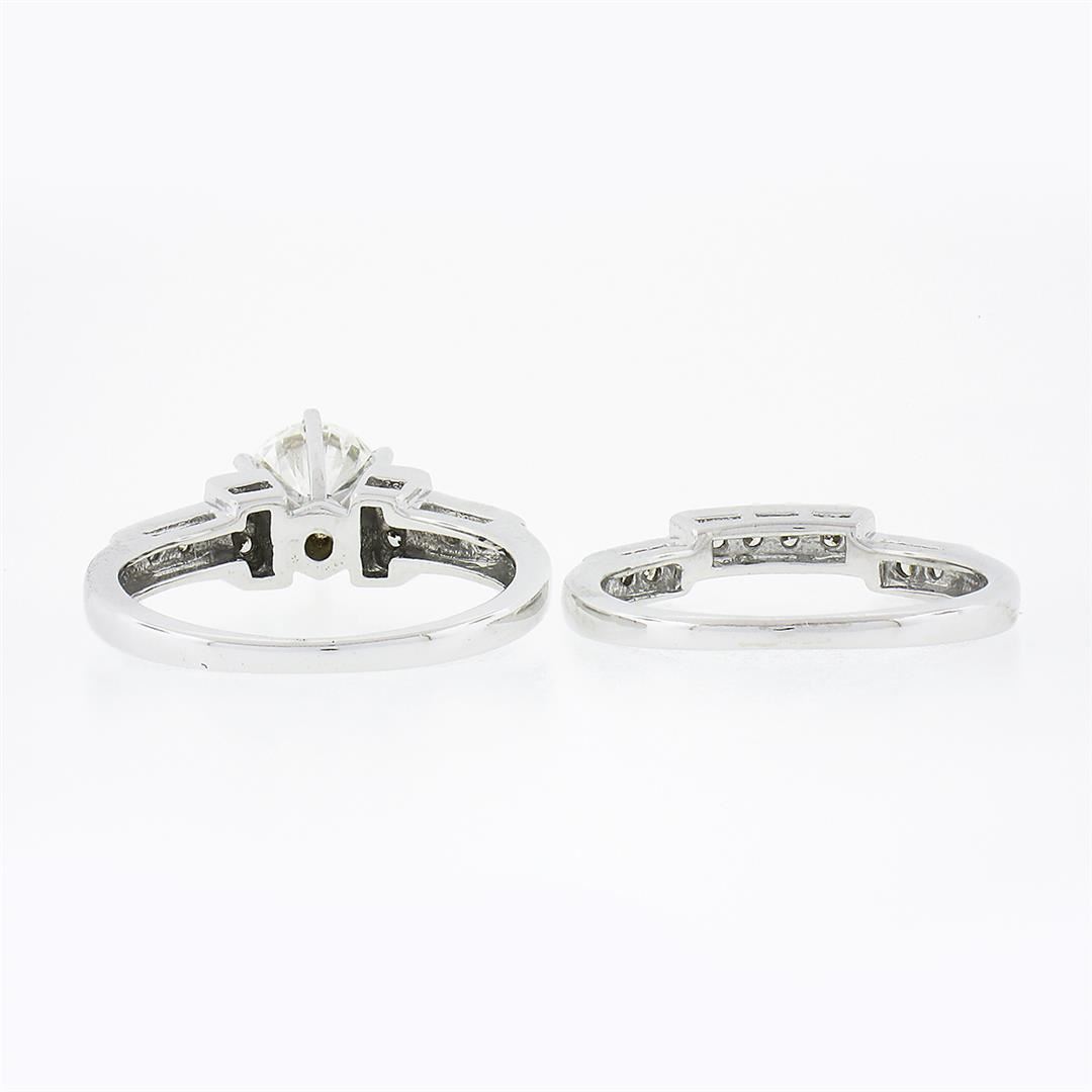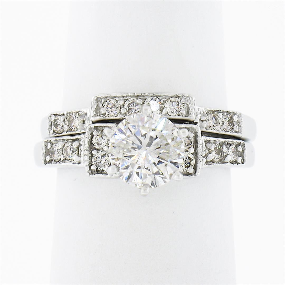 A solid 14k white gold engagement ring and wedding band set, with 1 round brilliant cut natural diamond (H - I1 ; 1.08ct), and 16 round brilliant cut natural diamonds (G/H - SI1/SI2 ; 0.30ctw). The ring is size 4.5, weighs a total of 4.80 grams, and measures 7.60mm wide.