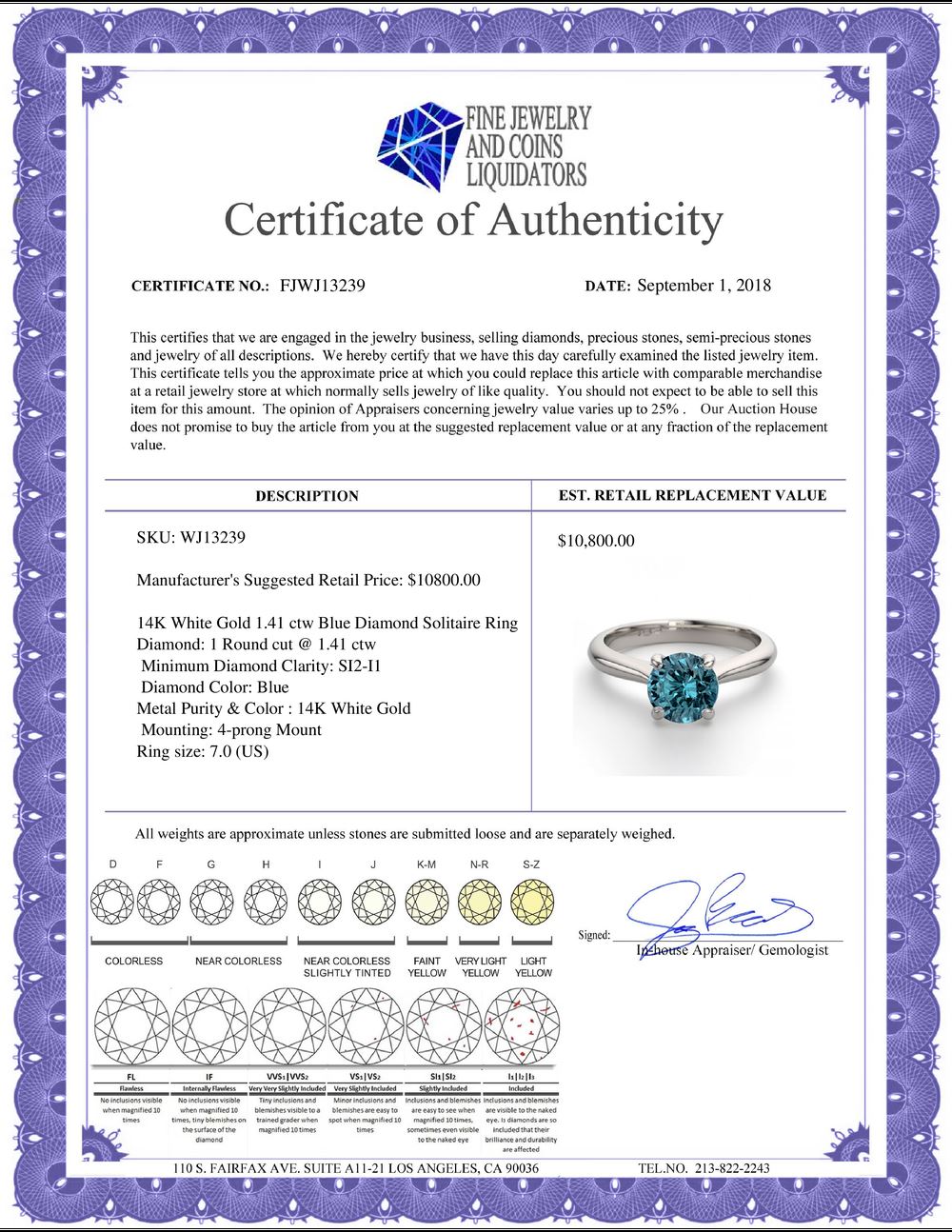 REF-243N6R ---- WJ13239 ----- Manufacturer's Suggested Retail Price: $10800.00 ----- 14K White Gold Jewelry 1.41 ctw Blue Diamond Solitaire Ring ----- Diamond: 1 Round cut @ 1.41 ctw