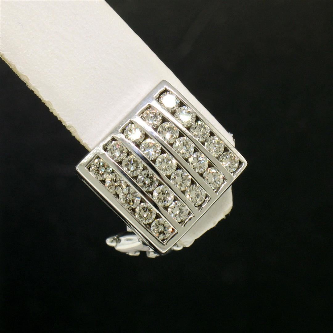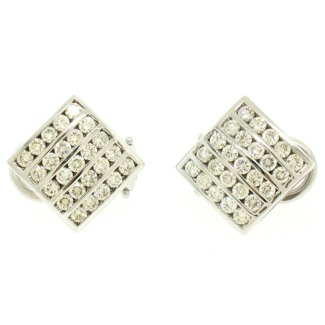 One Pair 14K White Gold 1.50 ctw 50 Round Diamond Square Multi Channel Omega Back Earrings. Item Details: Material: 14K Solid White Gold, Weight: 8.8 Grams, Stone(s): (50) Natural Genuine Diamonds - Round Brilliant Cut - G/H Color - VS1/VS2 Clarity - Multi Channel Set, Total Carat Weight: 1.50 (approx.), Backing: Post Backs w/ Omega Closures, Width: 15.5mm, Height: 15.5mm, Thickness: 4.8mm Condition: Like New!