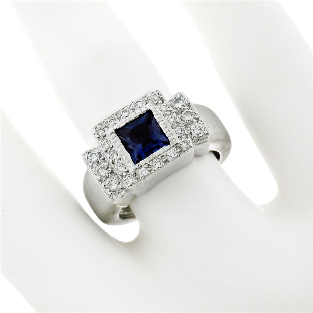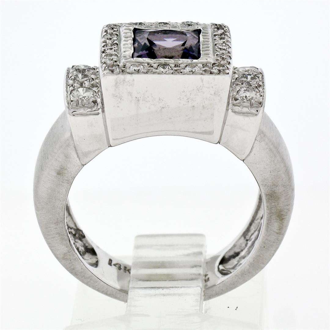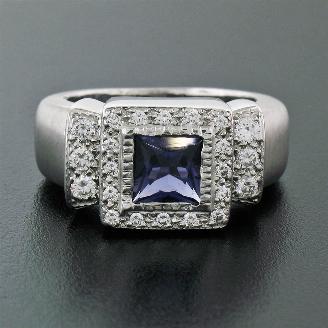 An estate solid 14k white gold ring, with 1 princess cut natural Iolite (1.15ct), and 22 round brilliant cut natural diamonds (F/G - VS1/VS2; 0.50ctw). The ring is size 5.5, weighs a total of 9.30 grams, and measures 10.25mm wide.