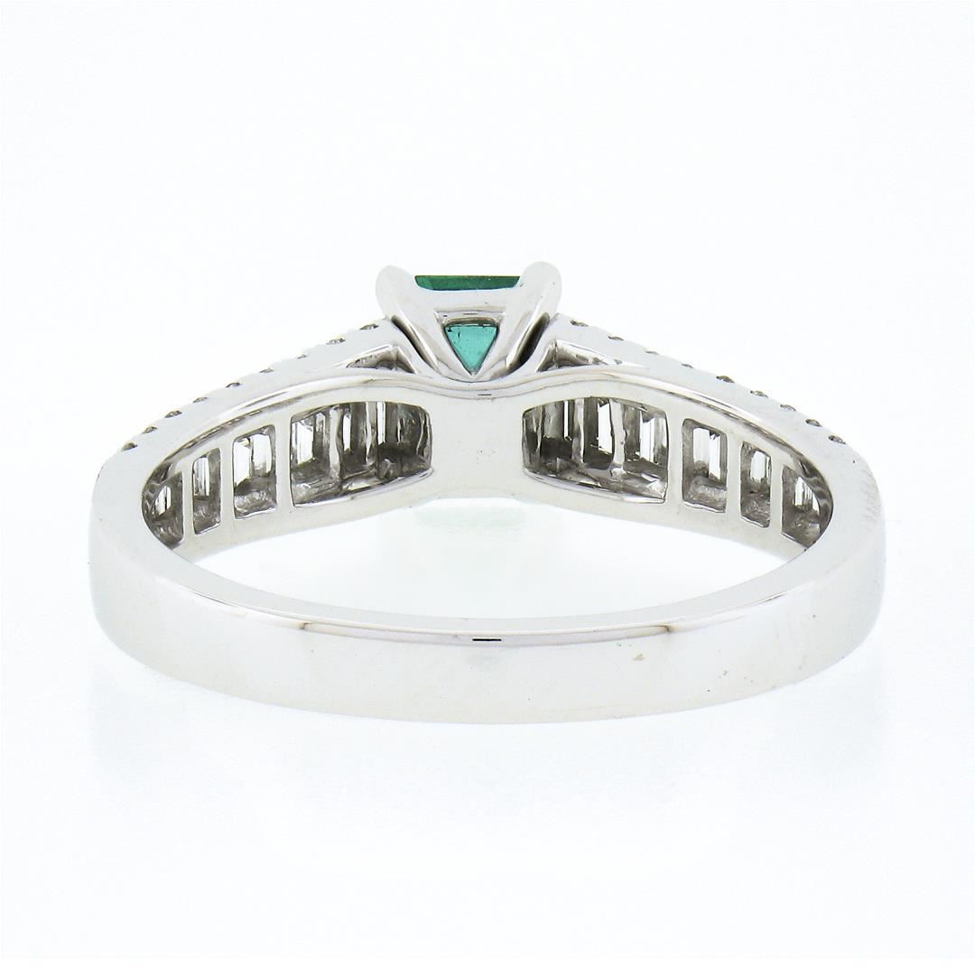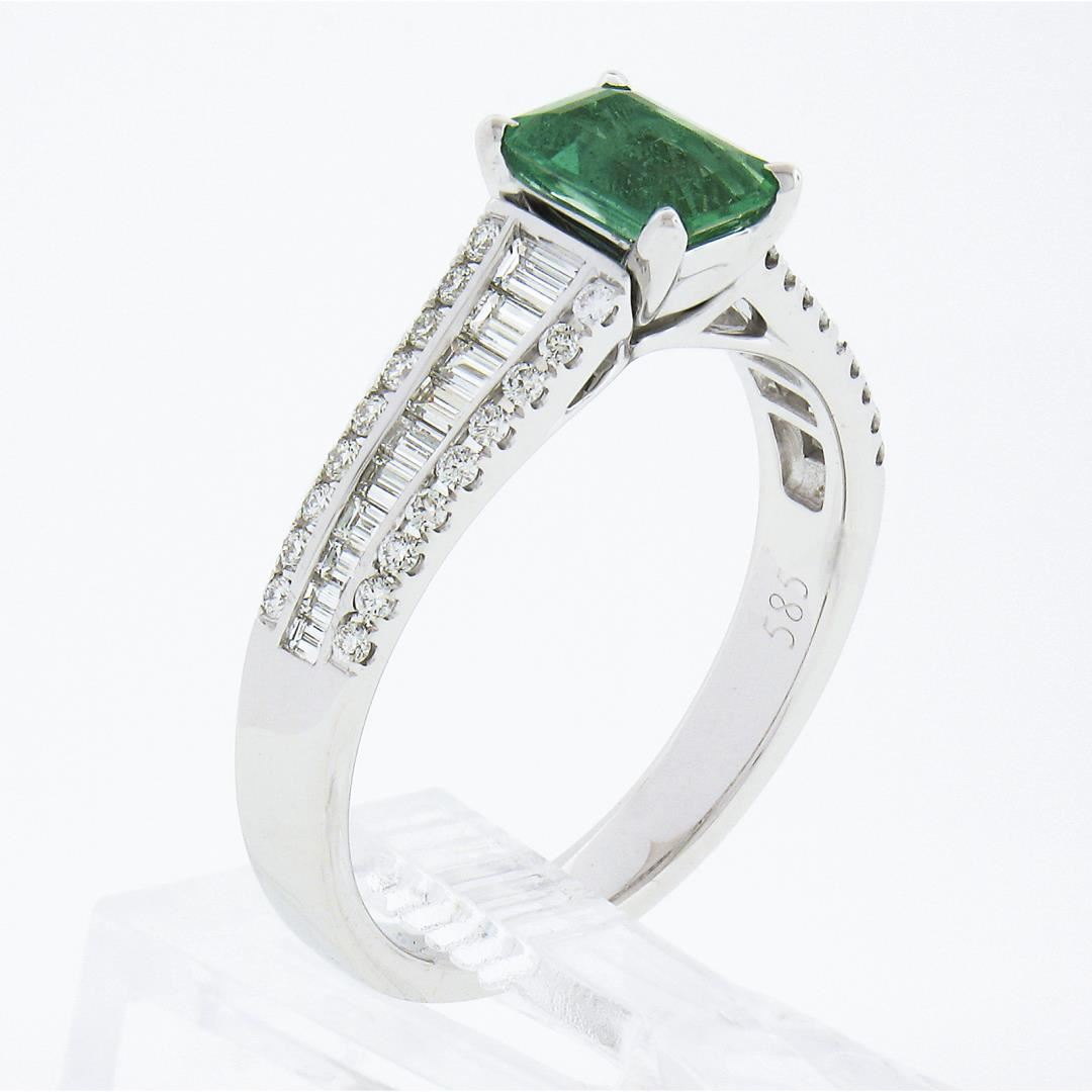 A solid 14k white gold ring, with 1 emerald cut natural emerald (0.75ct), and 20 baguette cut with 36 round brilliant cut natural diamonds (F/G - VS1/VS ; 0.96ctw). The ring is size 8.5, weighs a total of 4.59 grams, and measures 7.5mm wide.