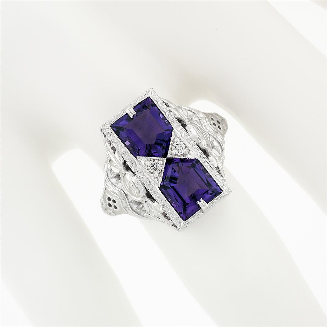 A new solid 14k white gold platter ring, with 2 custom cut natural amethysts (1.76ctw), & 2 round brilliant cut natural diamonds (G - VS2 ; 0.04ctw). The ring is size 6.5, weighs a total of 5.94 grams, and measures 17.2mm wide.