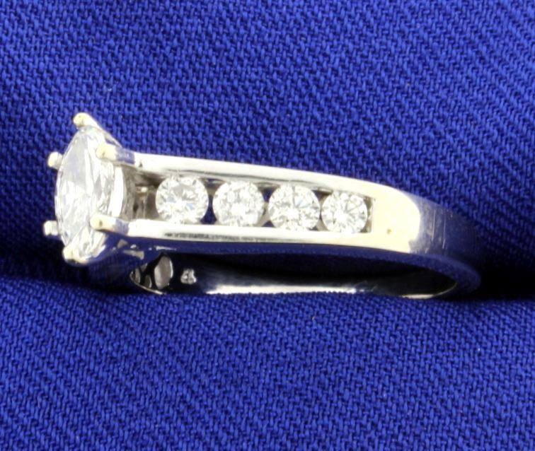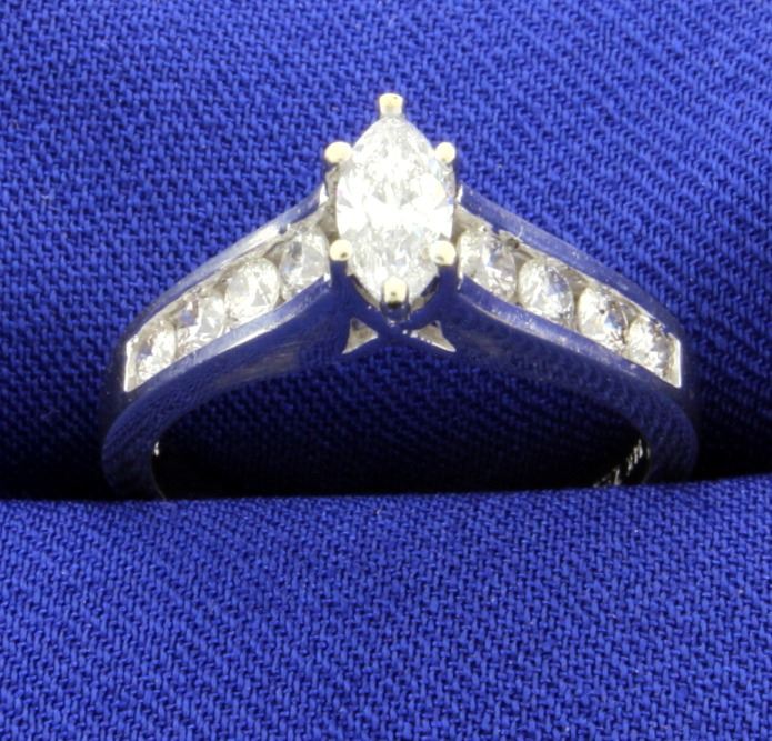 The center is a marquise, .35 carat SI-2 clarity, "I" color. There are 8-brilliant cut diamonds in a channel on sides. The 8 diamonds weigh approximately .65 carat total. The clarity is SI-1 to SI-2, color "H-I" size 7. 4.3g