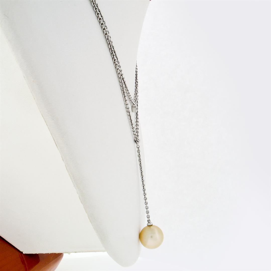 A solid 14k white gold layered dangle necklace with 1 round shape golden cultured pearl (12.0mm) and 1 round brilliant cut natural diamond (G - VS2; 0.08ct). 16 inch cable link chain, 9.67 grams total weight.