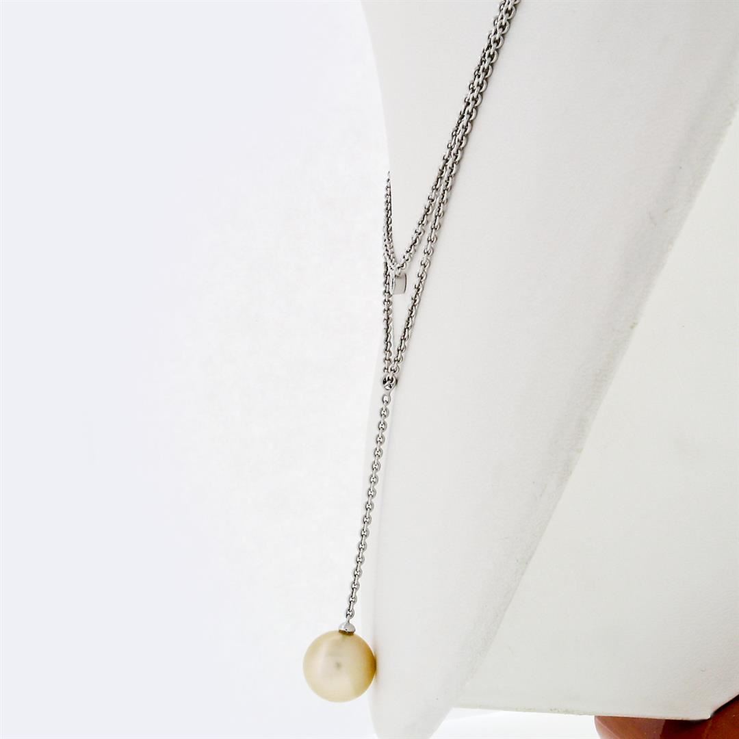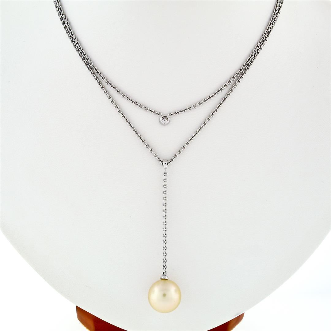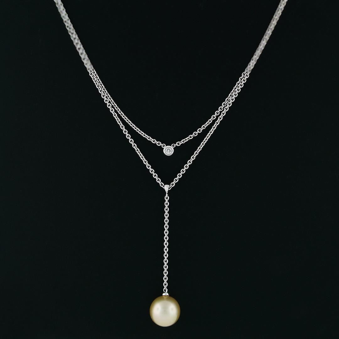 A solid 14k white gold layered dangle necklace with 1 round shape golden cultured pearl (12.0mm) and 1 round brilliant cut natural diamond (G - VS2; 0.08ct). 16 inch cable link chain, 9.67 grams total weight.
