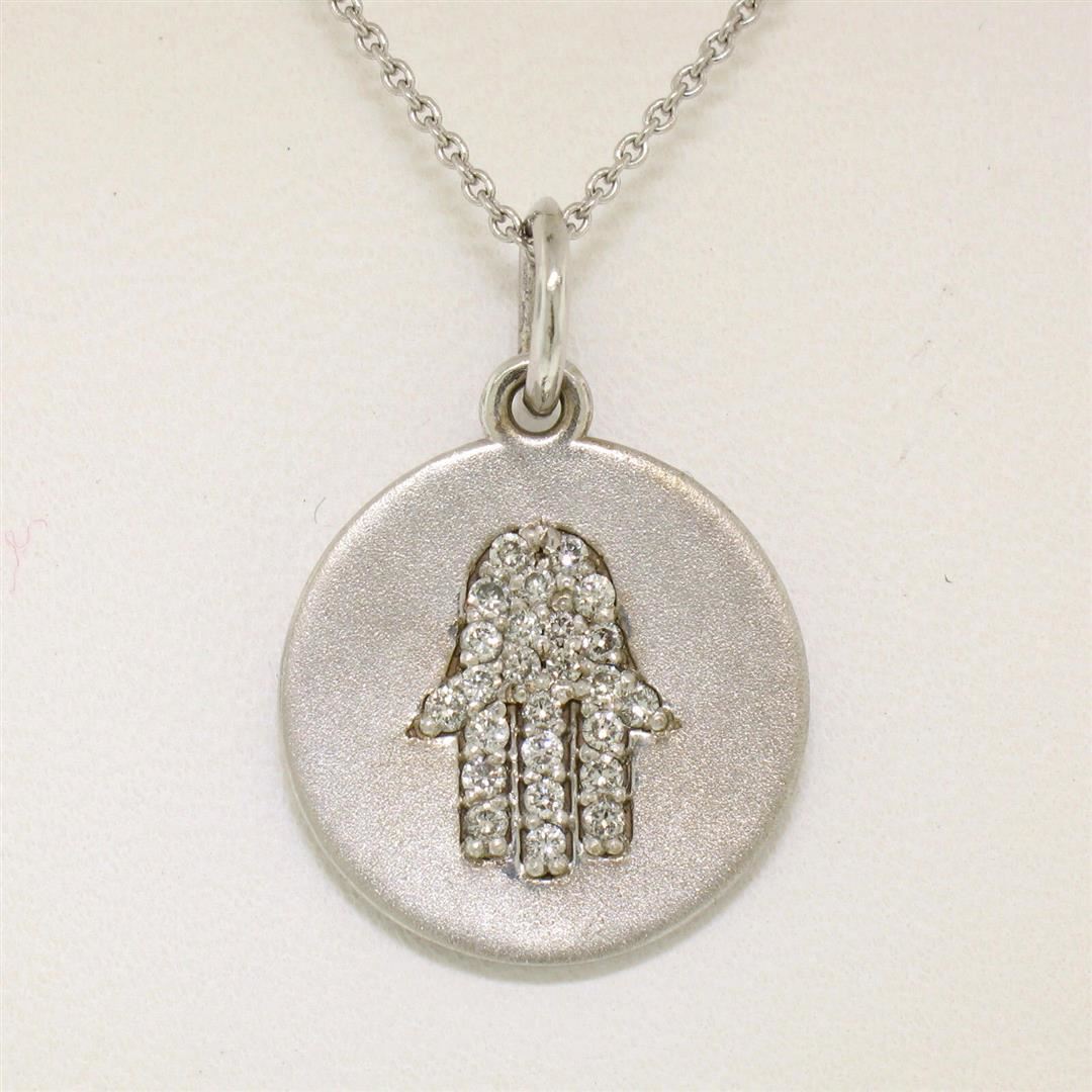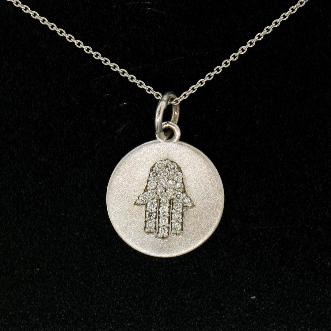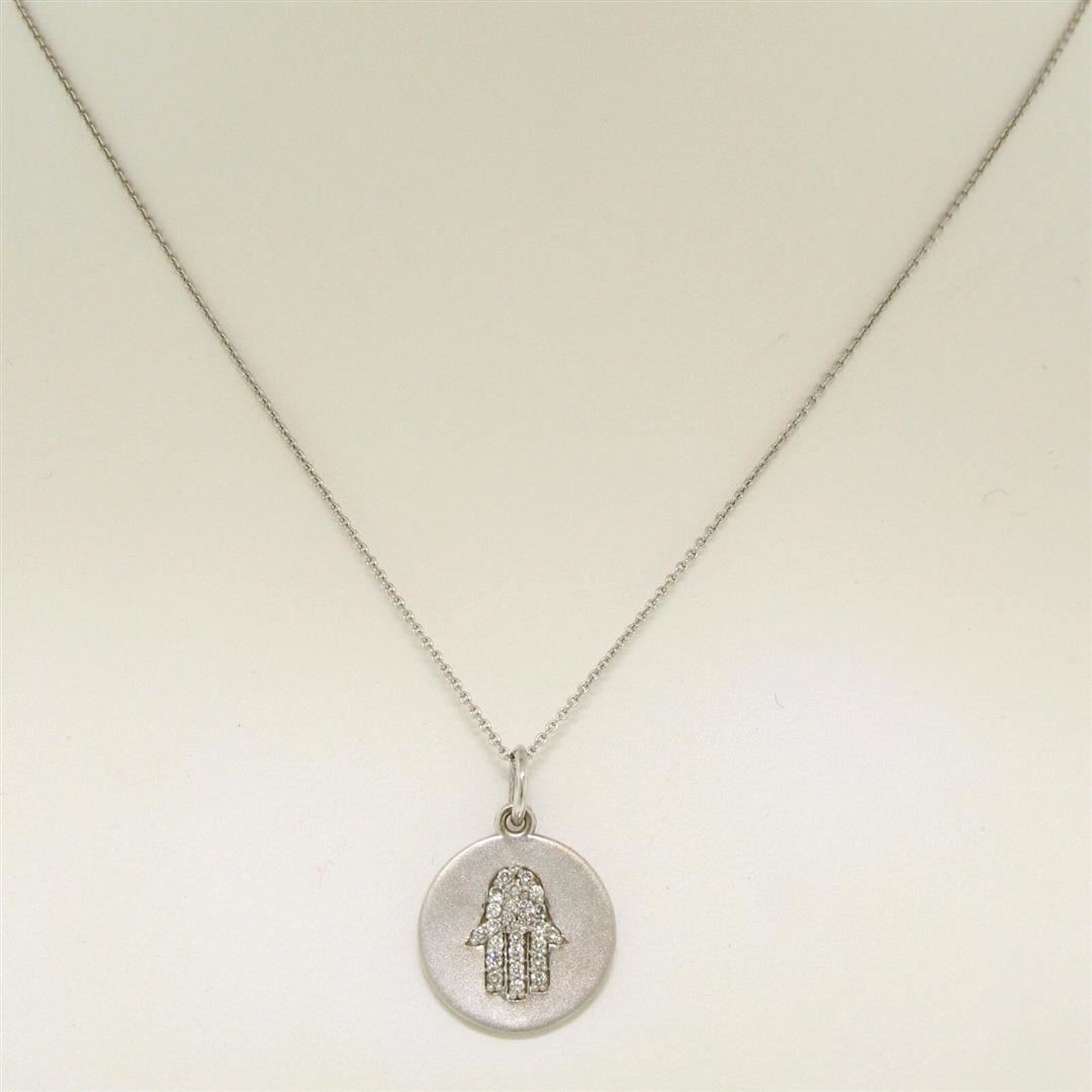 14K White Gold.18 ctw Diamond Hand of Fatima Hamsa Hand Disk Pendant w/16" Chain