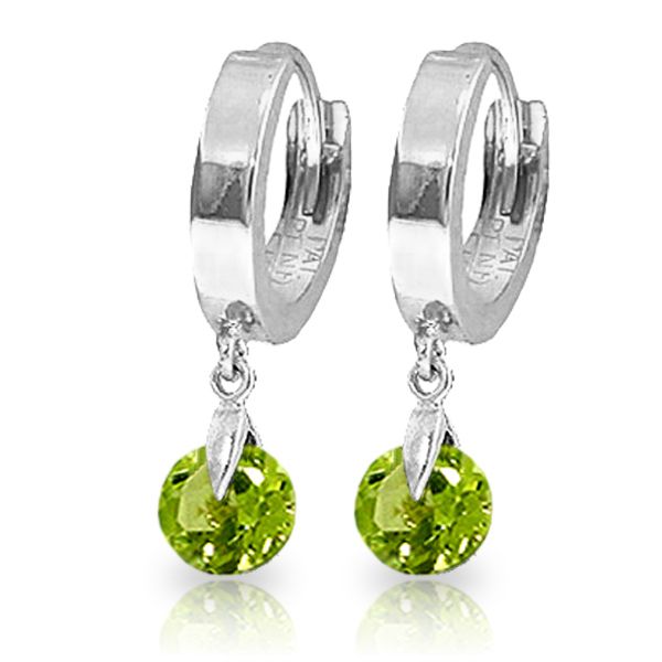 Multi-faceted round Peridots having a total of two carats, is showcased on this 14 karat Solid Gold Hoop Earrings.