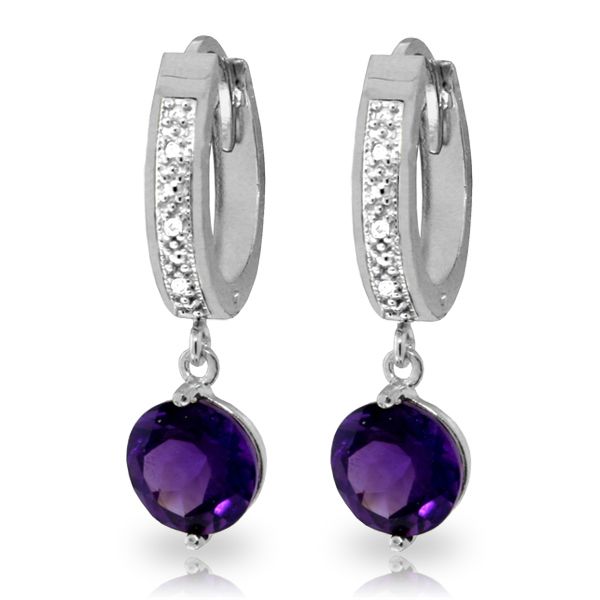 A 14 karat Hoop Earrings adorned with glittering Genuine Diamonds! This pair also feature a pair of round and rich colored Amethysts