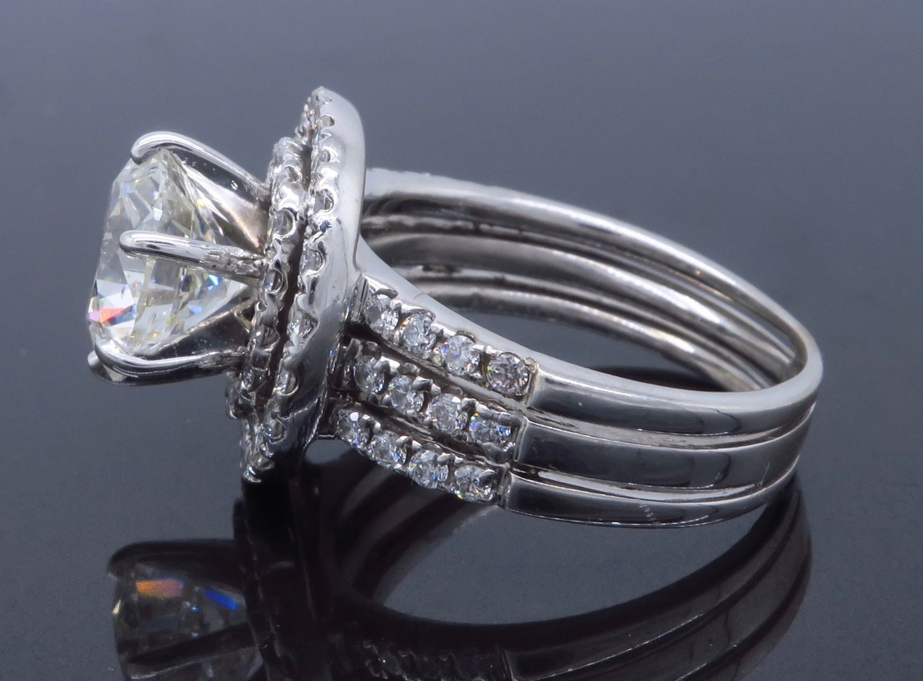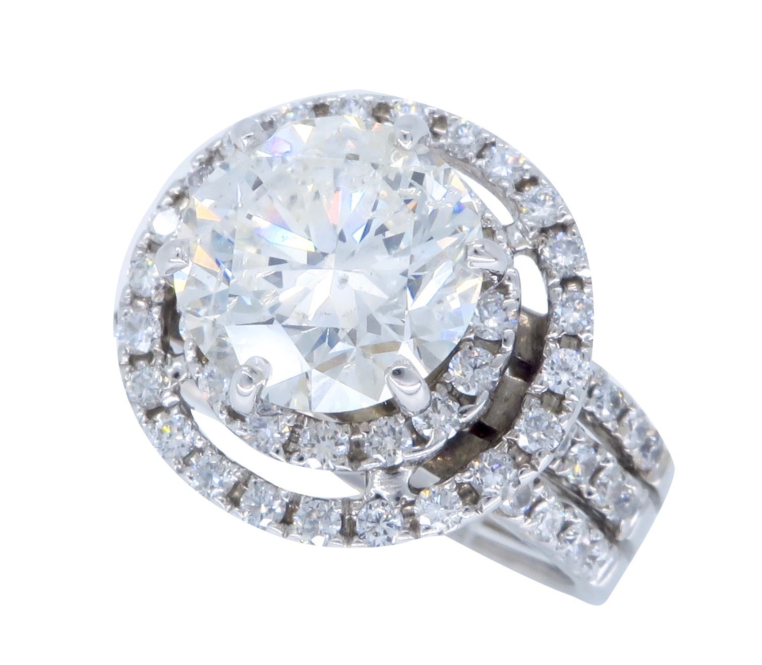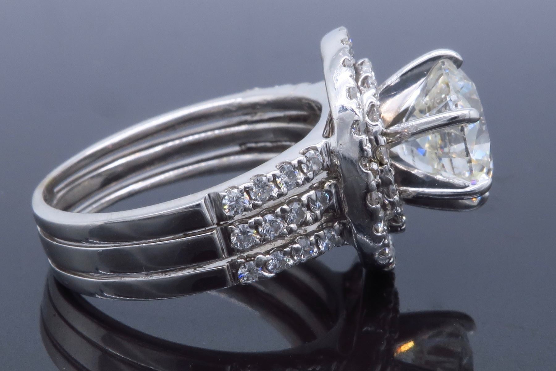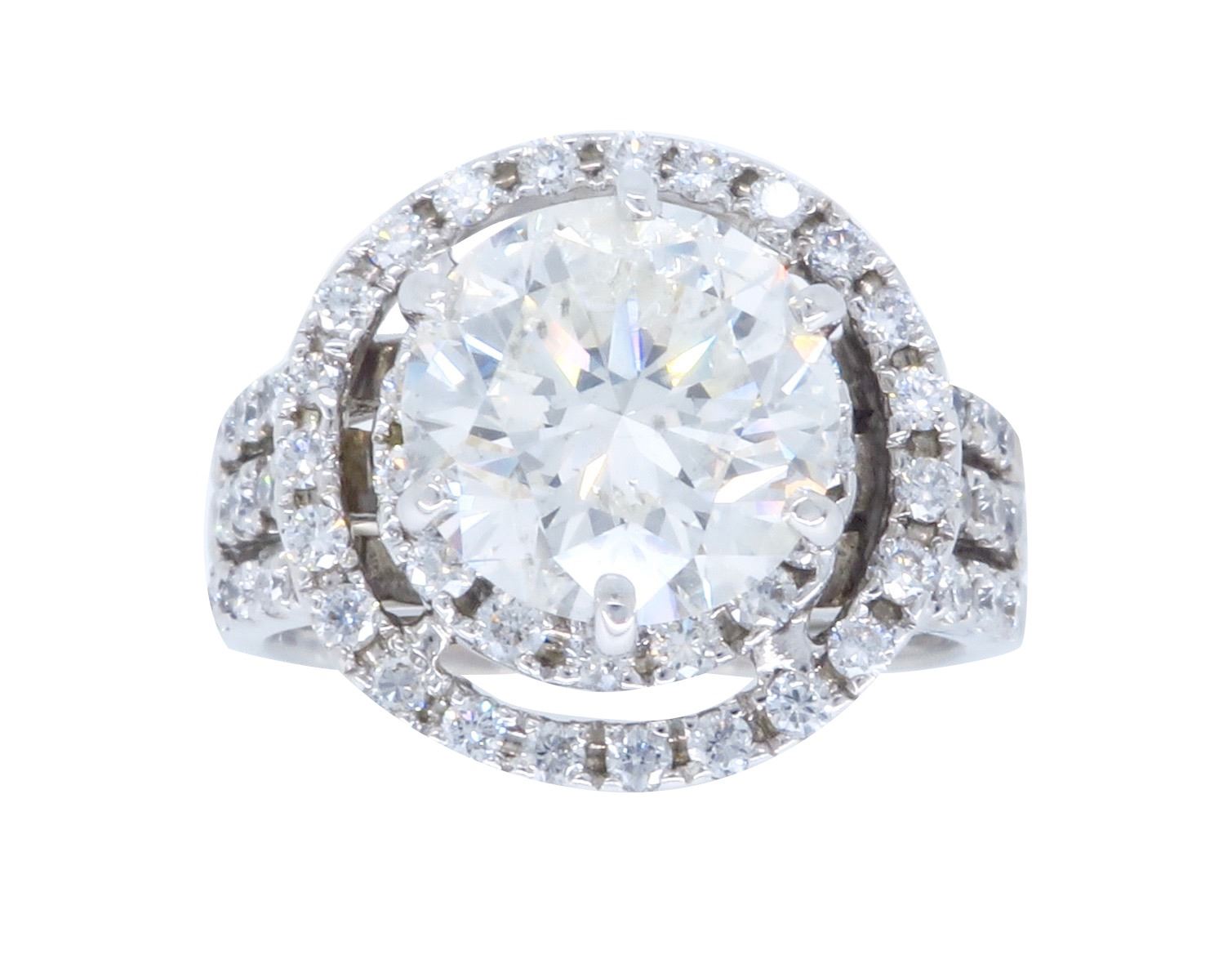 One 14K White Gold 2.98ctw Diamond Ring. (1) Round Diamond with a total weight of 2.37cts with a color of H-I and clarity of I-1. Center Diamond is laser scribed with La2510029735. Side round Diamonds with a total weight of 0.61cts. Total weight of this ring is 6.7 grams. Ring size is 5 resizable.