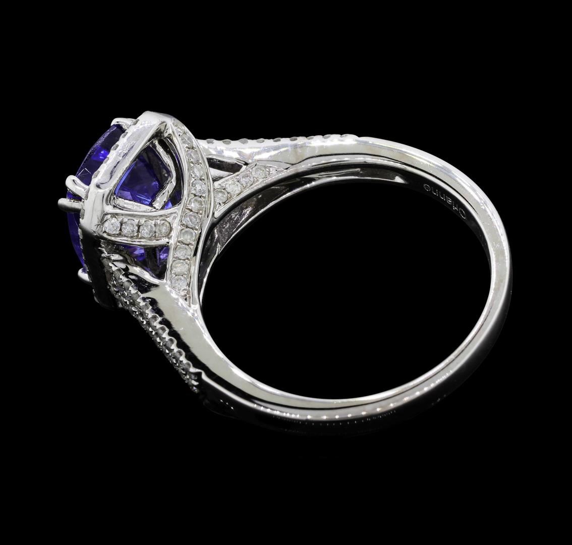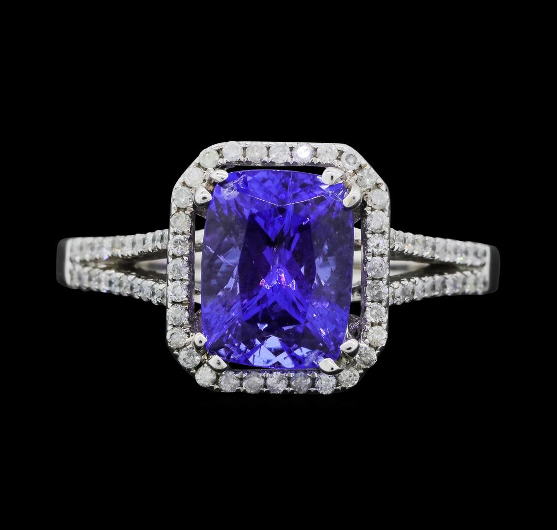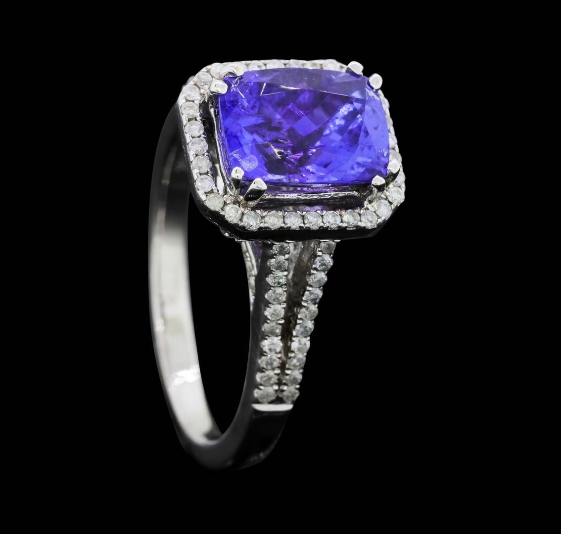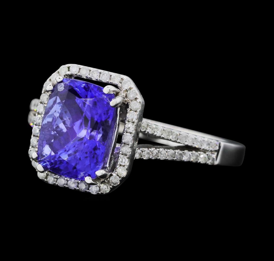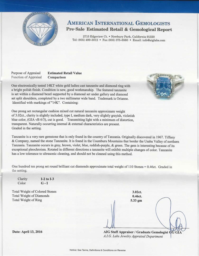 One electronically tested 14 KT white gold ladies cast tanzanite and diamond ring in beautiful like new condition. Holding this 3.02 carat rectangle, cushion mixed cut tanzanite gem with a type I clarity in a medium, violetish, blue color. This tanzanite stone is set within a diamond bezel supported by a diamond set under gallery and diamond set split shoulders, completed by a two millimeter wide band. These one hundred ten prong set, round, brilliant cut diamonds have a total weight of 0.46 carat, graded in setting. The rare tanzanite gemstone is interesting because of it's exceptional pleochroism which may exhibit multiple changes of color depending on the angle and rotation. Total weight of this ring is approximately 5.33 grams. AIG Appraised.