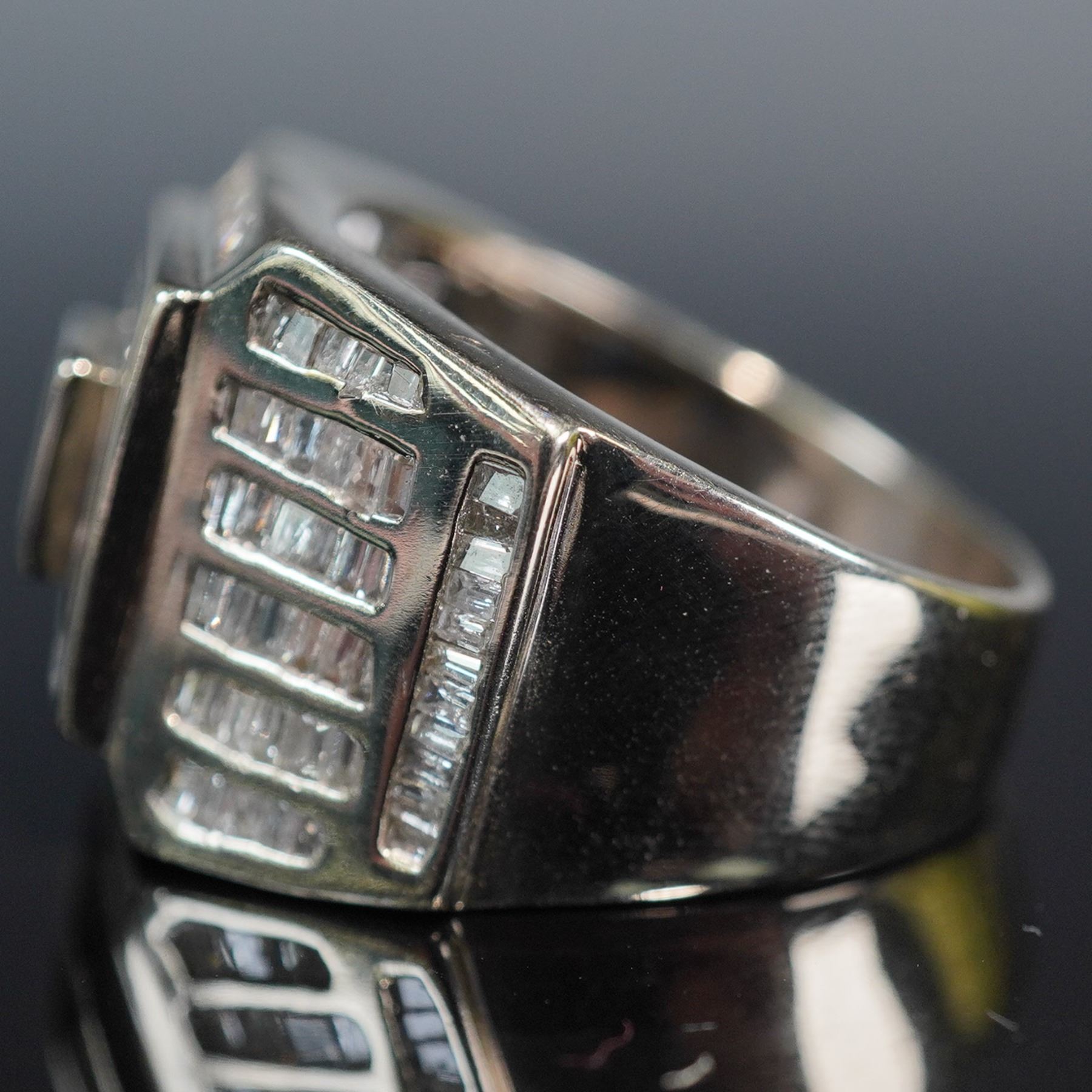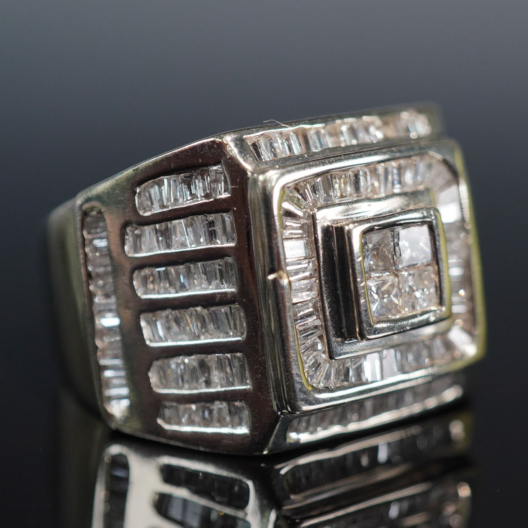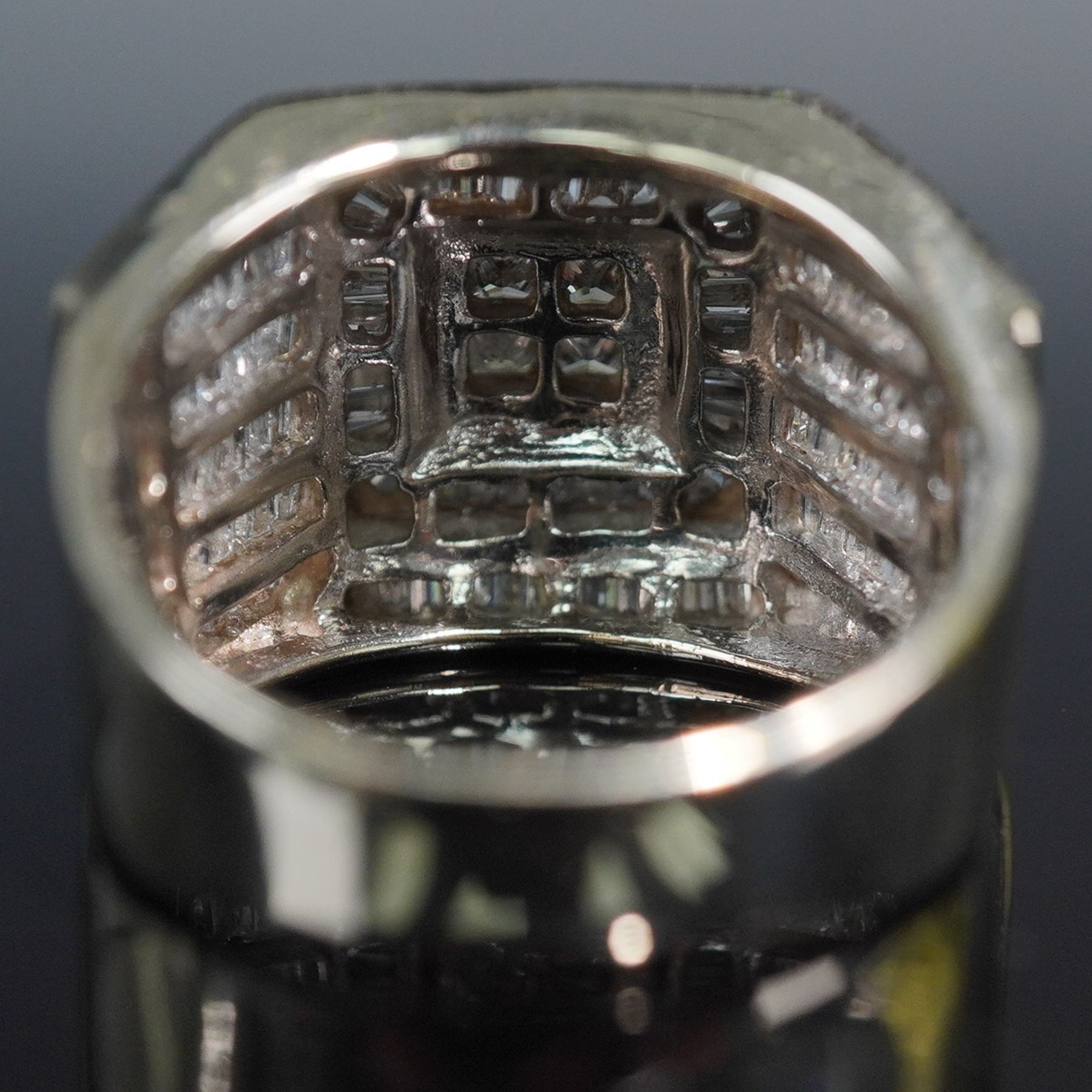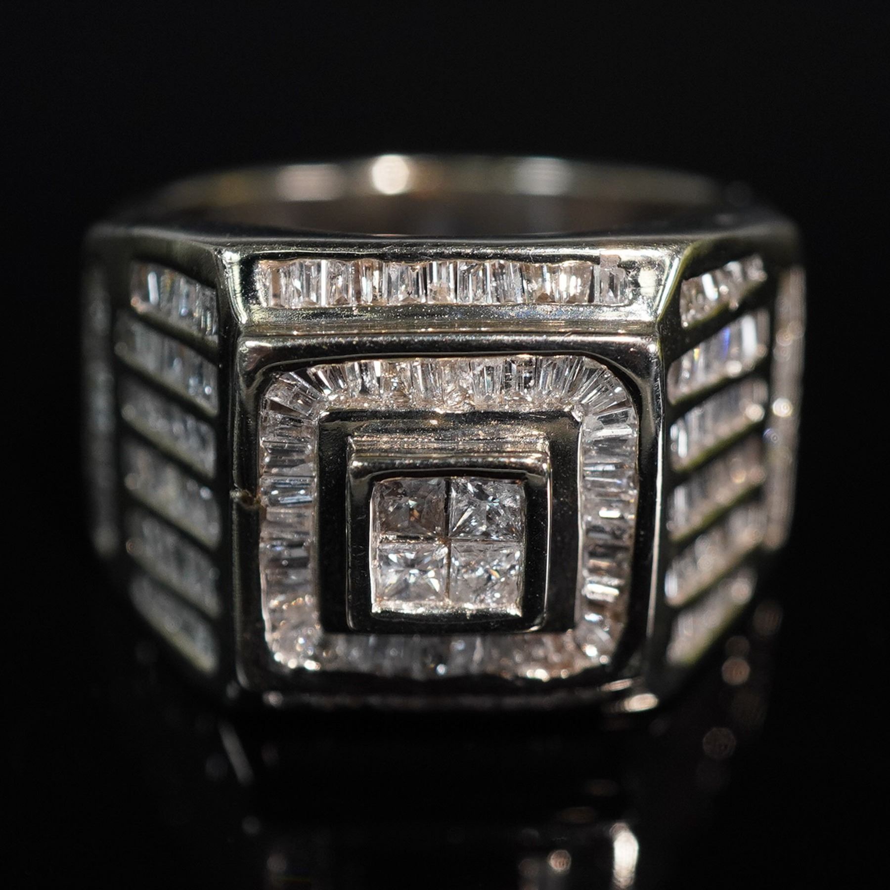A striking showcase of diamonds, this luxurious ring is finely crafted in 14K white gold. The bold architectural design centers on four princess cut diamonds arranged in a square, encircled by channel set baguette diamonds that continue elegantly down the shoulders. Together the diamonds weigh 3.02 carats total, with near-colorless H color and clarity graded SI2 to SI3, producing exceptional brilliance and sparkle. Substantial in presence yet refined in detail, this piece embodies modern sophistication and timeless luxury. The ring weighs approximately 11.8g.
