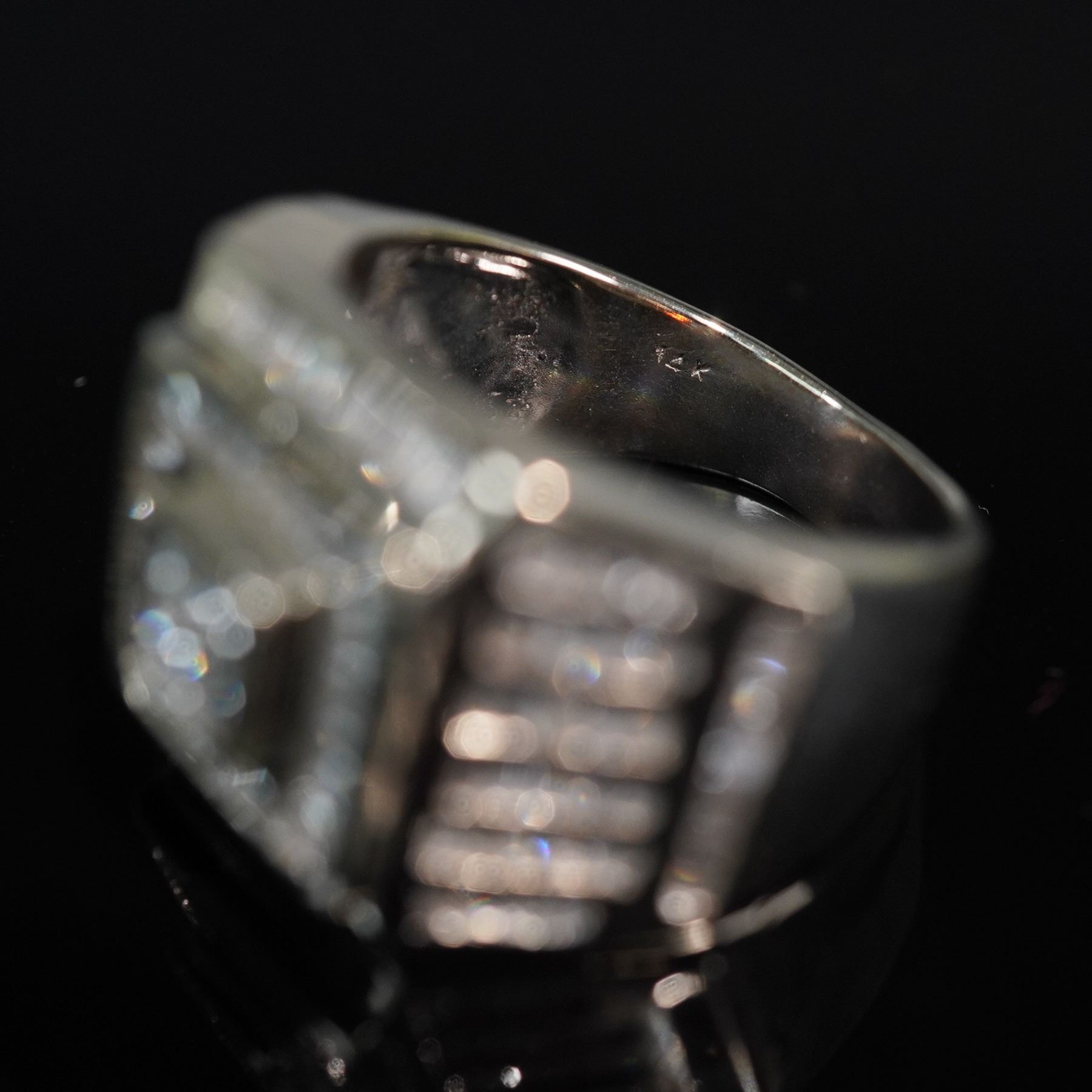 A striking showcase of diamonds, this luxurious ring is finely crafted in 14K white gold. The bold architectural design centers on four princess cut diamonds arranged in a square, encircled by channel set baguette diamonds that continue elegantly down the shoulders. Together the diamonds weigh 3.02 carats total, with near-colorless H color and clarity graded SI2 to SI3, producing exceptional brilliance and sparkle. Substantial in presence yet refined in detail, this piece embodies modern sophistication and timeless luxury. The ring weighs approximately 11.8g.