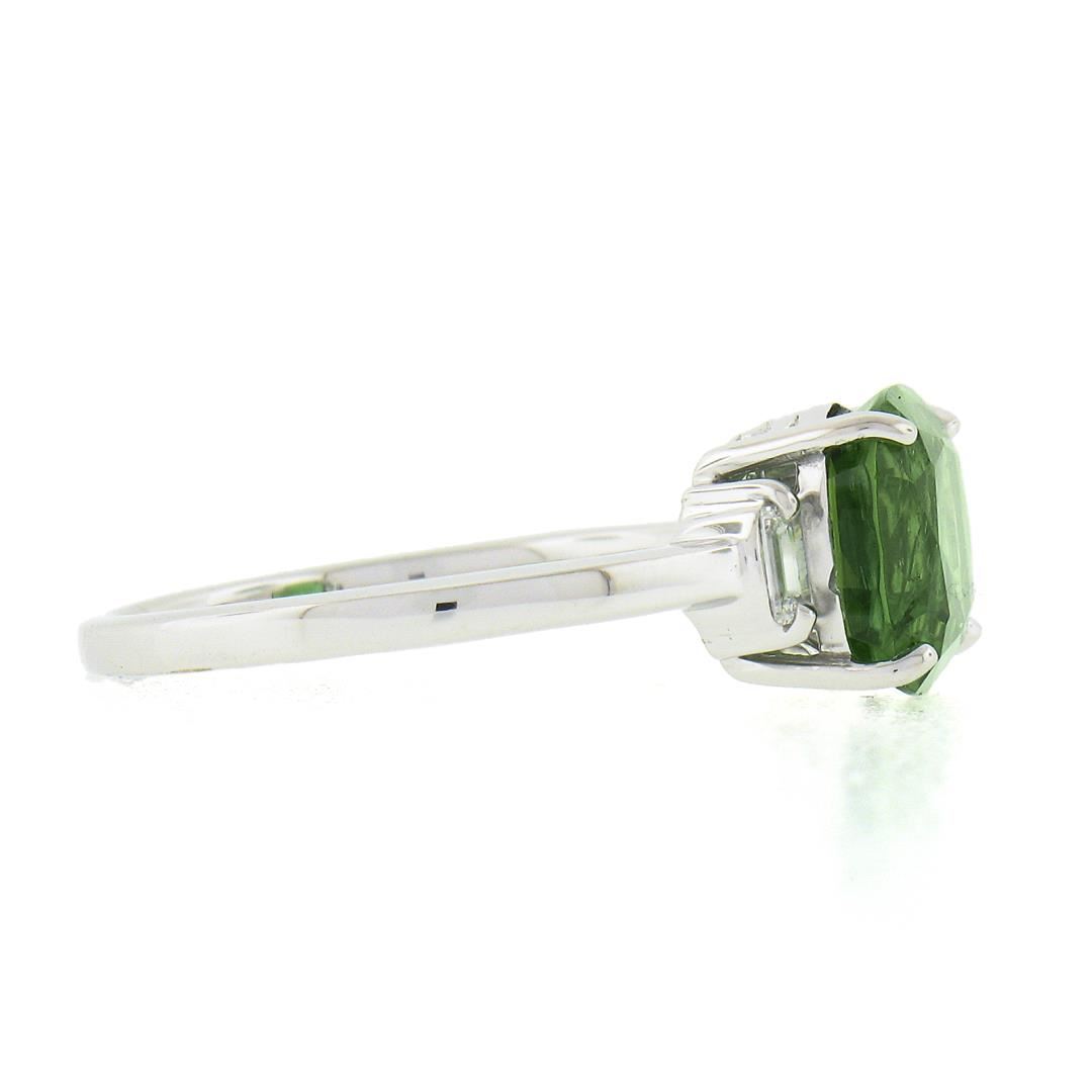 A solid 14k white gold ring, with 1 cushion cut natural tourmaline (2.88ct), accented with 2 baguette cut natural diamonds (G/H - VS2/SI1 ; 0.16ctw). The ring is size 6.5, weighs a total of 2.92 grams, and measures 8.3mm wide.