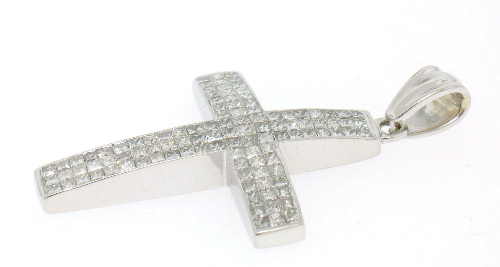 One Unisex 14K White Gold 3.25ctw Arched Invisible Set Princess Cut Diamond Cross. Item Details: Material: 14K Solid White Gold, Weight: 6.50 Grams, Stone: (108) Natural Genuine Diamonds - Princess Cut - Invisible Set - G/H Color - SI1 Clarity - 3.25ctw (approx.), Width: 25.91mm, Height (w/o Bail): 37.78mm, Height (w/ Bail): 47.74mm, Thickness: 4.69mm, Chain: Not Included. Condition: Like New